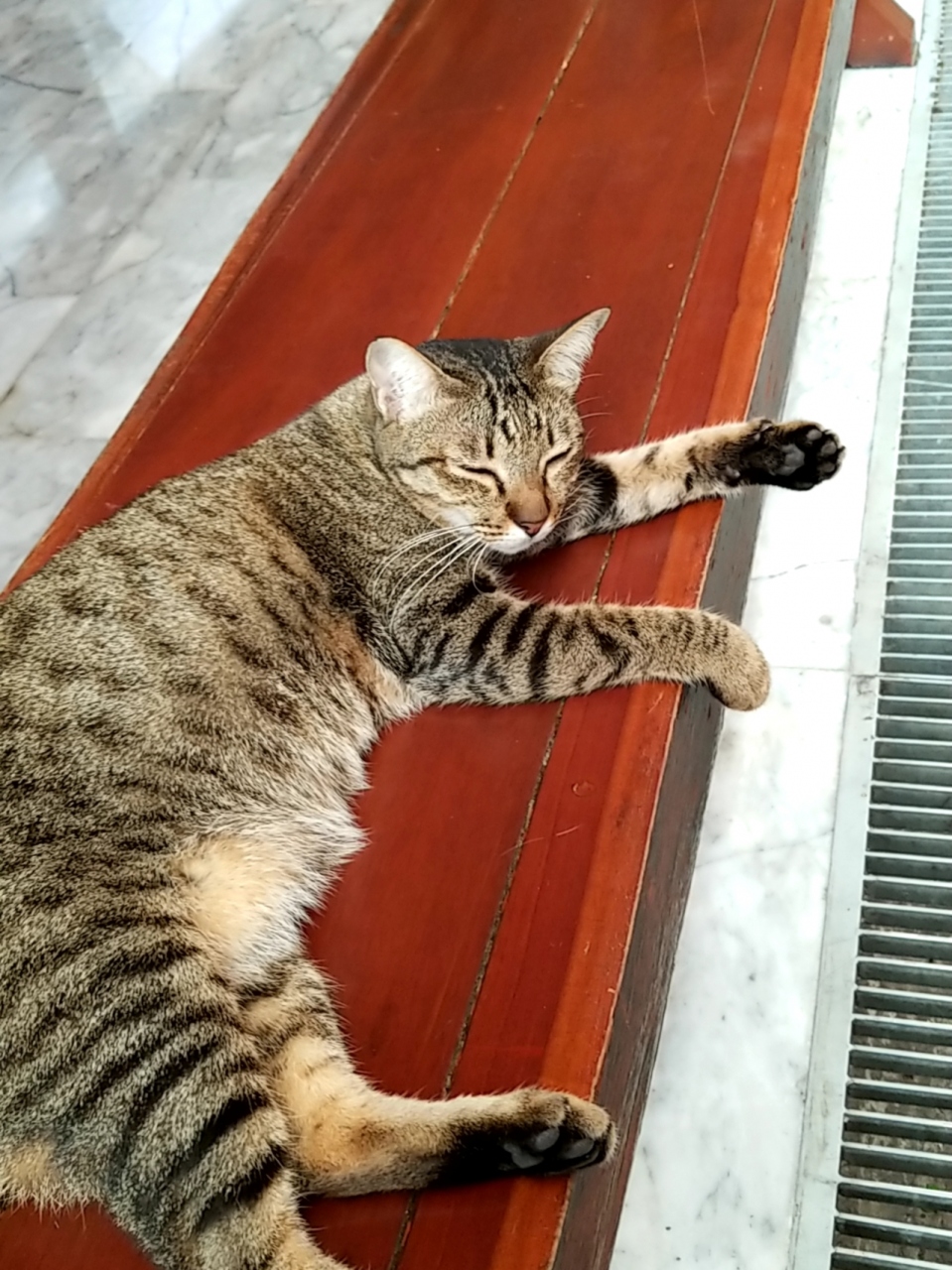 その後、お寺の本堂(?)の仏様へお布施でお花とお線香、金箔をもらい、お参りしてきました。回廊にはネコたちがくつろいでいました。