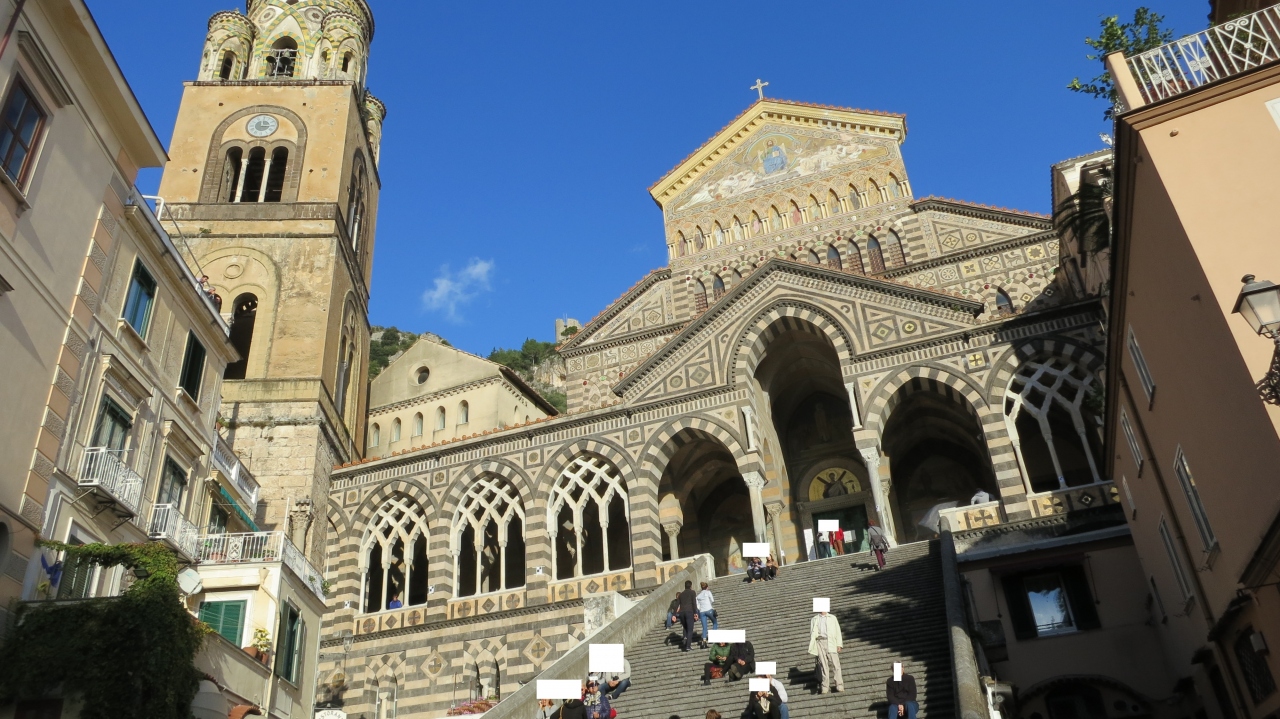アマルフィ ドゥオーモはアラブの影響を強く受けている建物なのか、まず目に入ってきたのはアラブ調の大聖堂のファサードでした。2色の石材が交互に組まれたアーチとその上部の幾何学模様がとても美しく思えました。正面扉の上の聖アンデレの絵も鮮やかで印象的でした。