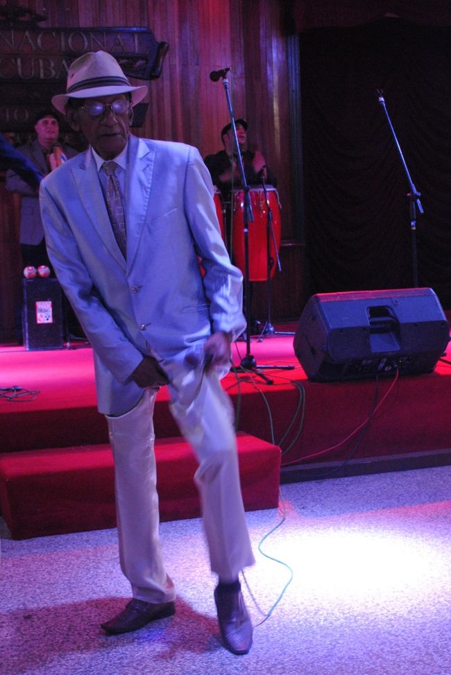 ステージに出てくるときは若者にひかれてヨチヨチ歩いてきたのに、演奏が始まると、クッと腰が入り、ノリノリのダンスと歌。