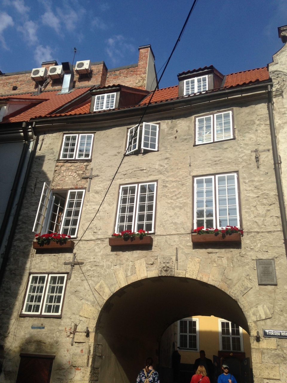 リガの旧市街にある城壁を利用した門で、城壁を利用して住居スペースになっています。外側は城壁部分のような造りで飾り気もありませんが、内側には窓が多く花も飾ってありました。横には城壁跡を見ることができました。