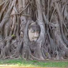 タイの古都、アユタヤ観光の目玉となる大きな寺院跡です。1767年のビルマ軍の侵攻により、壊滅的なダメージを受け、現在のような建物の土台や半壊した仏像などが残る廃墟となりました。なかでも菩提樹の根に取り込まれてしまった石仏の頭がもっとも有名で、アユタヤといえばこの仏頭を思い出すほどアユタヤの代表的な観光スポットになっています。