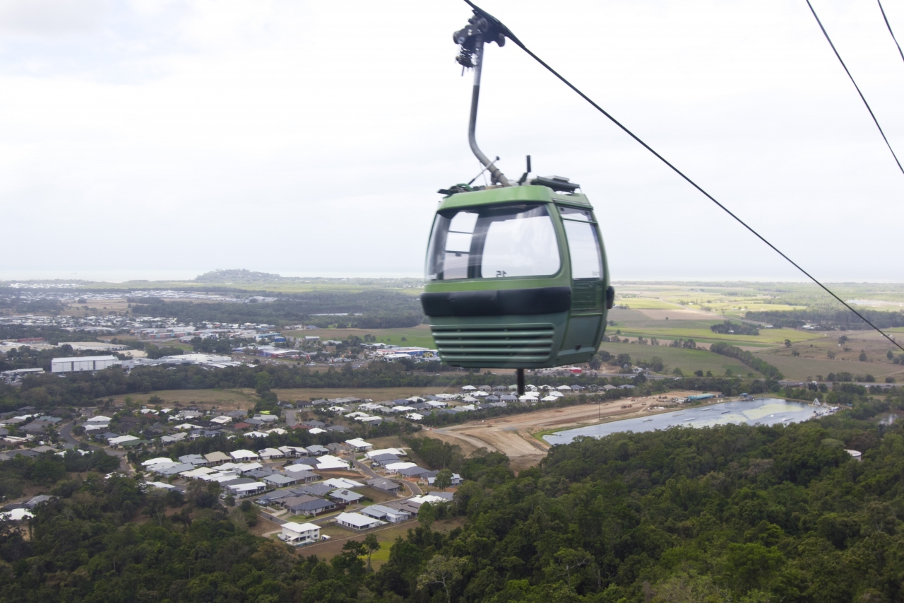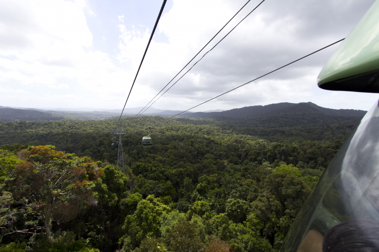 日本にあるロープウェイはスキー場や勾配のきつい山等で上る為の乗り物で距離も短いですが、スカイレールは標高300のキュランダ高原へ行く為に7.5kmも距離をつかって上る勾配のゆるいロープウェイなので、日本ととても違った感覚を感じる事ができます。