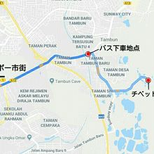 Medan Kiddバスステーション発の「my BAS」T33b(T33aも?)の市バスで最寄りのバス停(タンブン・タウン)へ。出発時間は7:00,9:00,11:00,13:00,15:00,17:00,19:00,21:00。私は新市街のJalan Sultan Idris Shahにある「Gerbang Malam」バス停から乗車(1.3RM)、上記の時刻の約6分後にやって来ます(ここまでのルートは未確認)。バスは東方に進み、高速道路をくぐります。その先の小さな川を渡った所にあるバス停で下車。ここからチベット寺院までは約2.5kmです。詳細は写真の地図、google mapなどで確認して下さい。帰りのバスの時間は不明ですが私の場合は15:15頃にバスがやって来ました。2H毎に出発していると考えると、この時間の±2h毎と思われます。