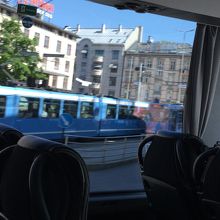 派手な色の2階建てバス、それにトラムも走っていますね。