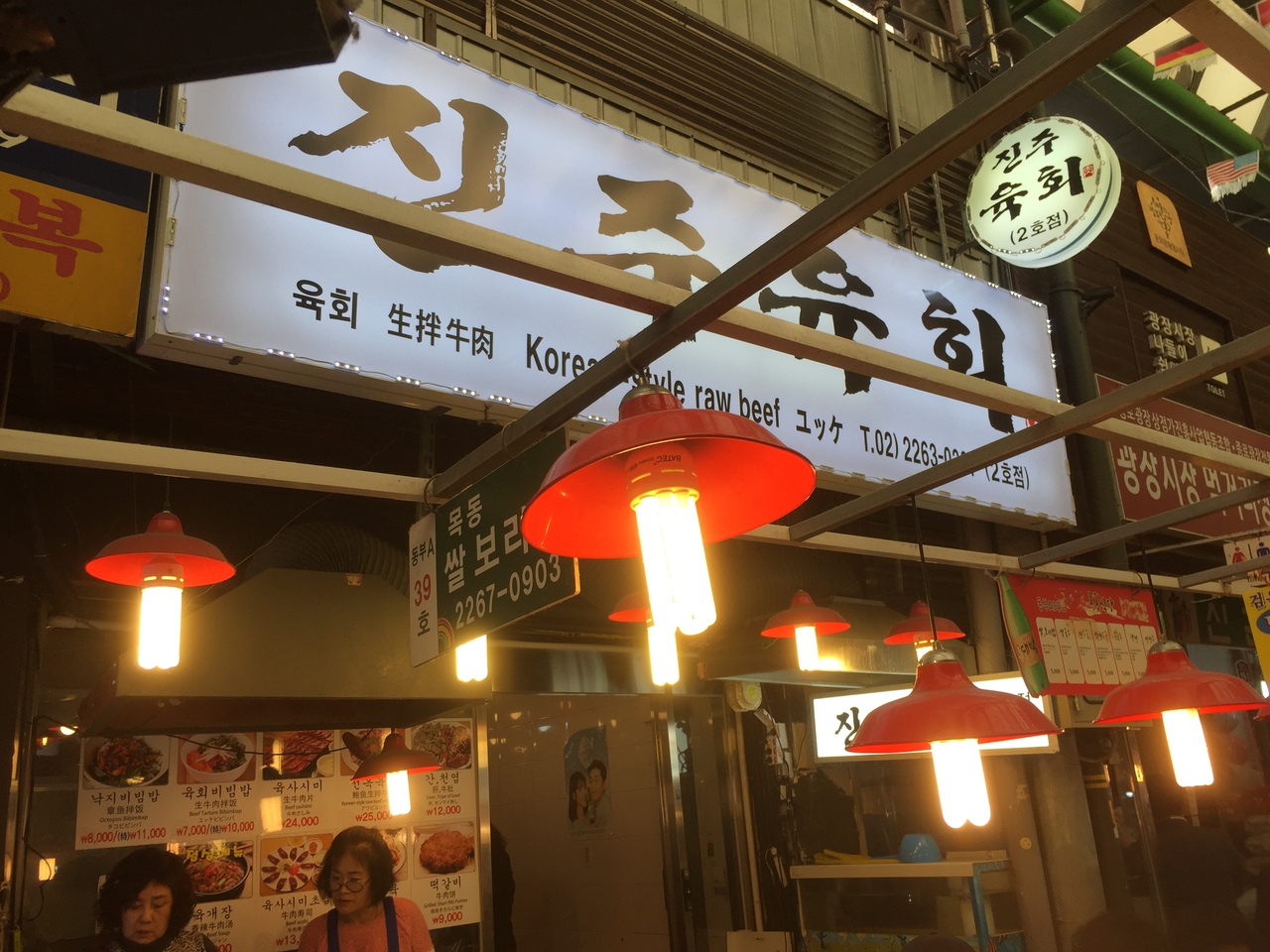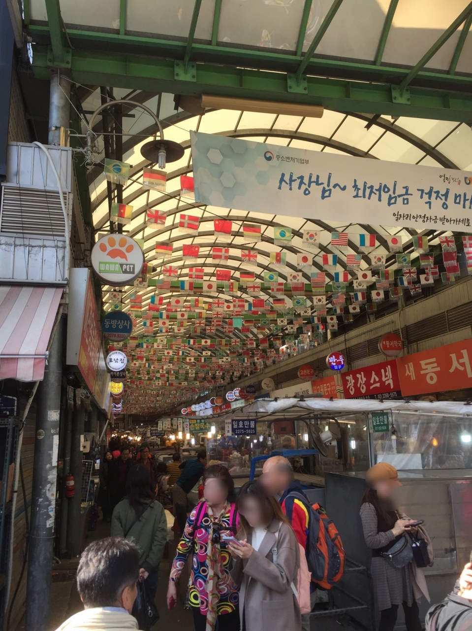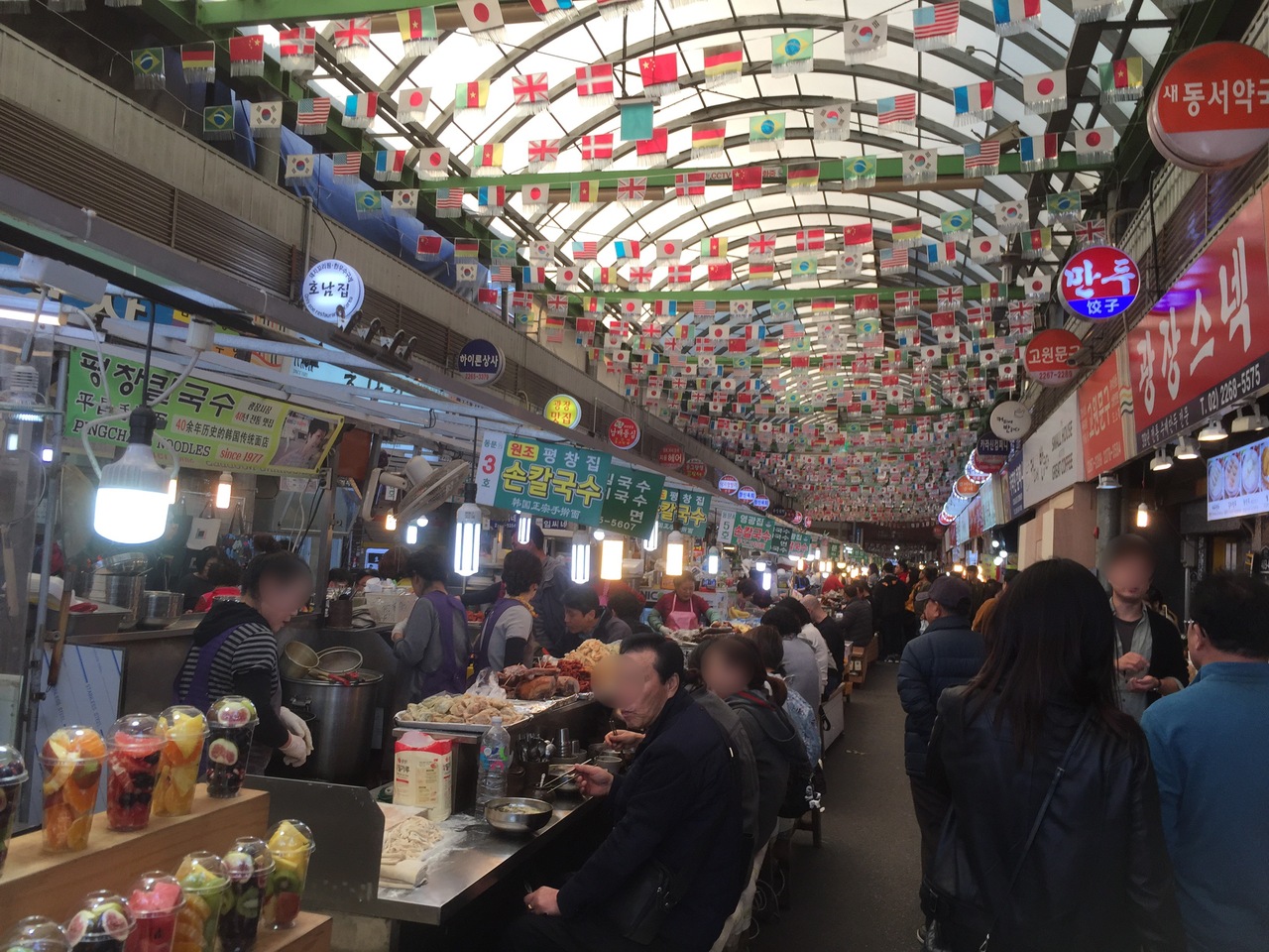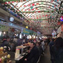 明洞や東大門から徒歩圏内です。うまいもん通りと言われていて、物凄く沢山がいました。また、通りの真ん中を屋台がぎっちりと占拠していて、歩くのも大変でした。屋台でお昼ごはんにしようと歩きまわりましたが、ほとんど席が空かず、店舗で食べることにしました。予め人気店を調べ、早めに行く事をお勧めします。