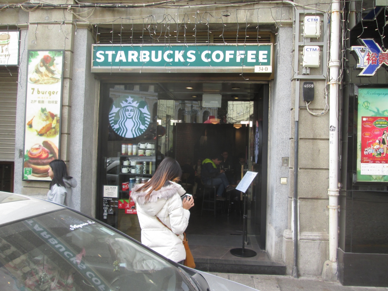 マカオ、大三巴街にあるスターバックスコーヒーです。スターバックスコーヒーは、中国語では「星巴克珈琲」と書きます。また、緑のシンボルマークで区別が付きます。大三巴街は観光、ショッピングのため訪問する人が多い場所なので、ここのスターバックスは混雑していました。