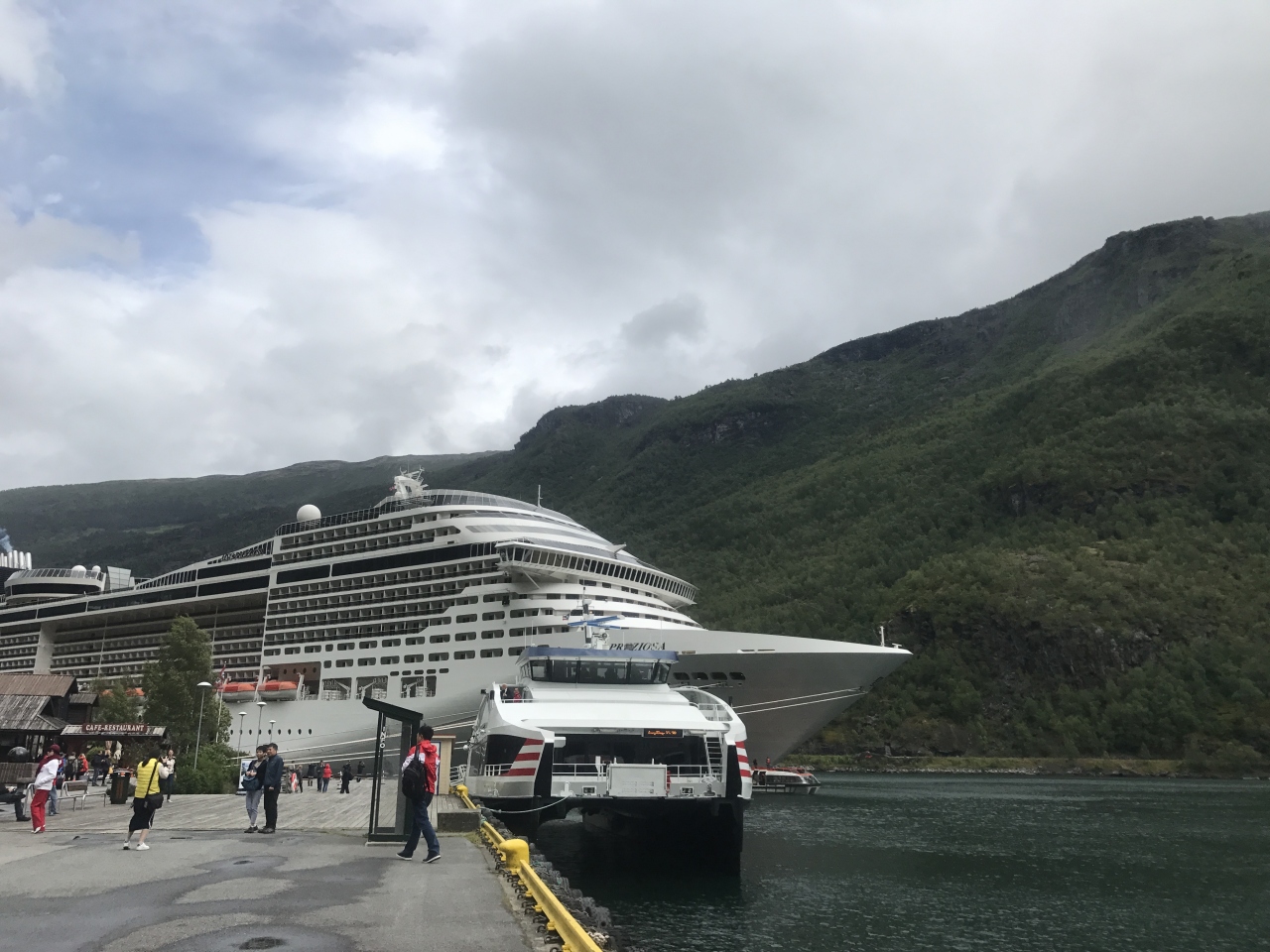 ベルゲン港から出発し、ソグネフィヨルドクルージングのために停まりました。周囲は山々に囲まれていて、ノルウェーの大地を感じることができる空間です。レストランやお土産屋さんもあり、プチ観光できるエリアでもあります。