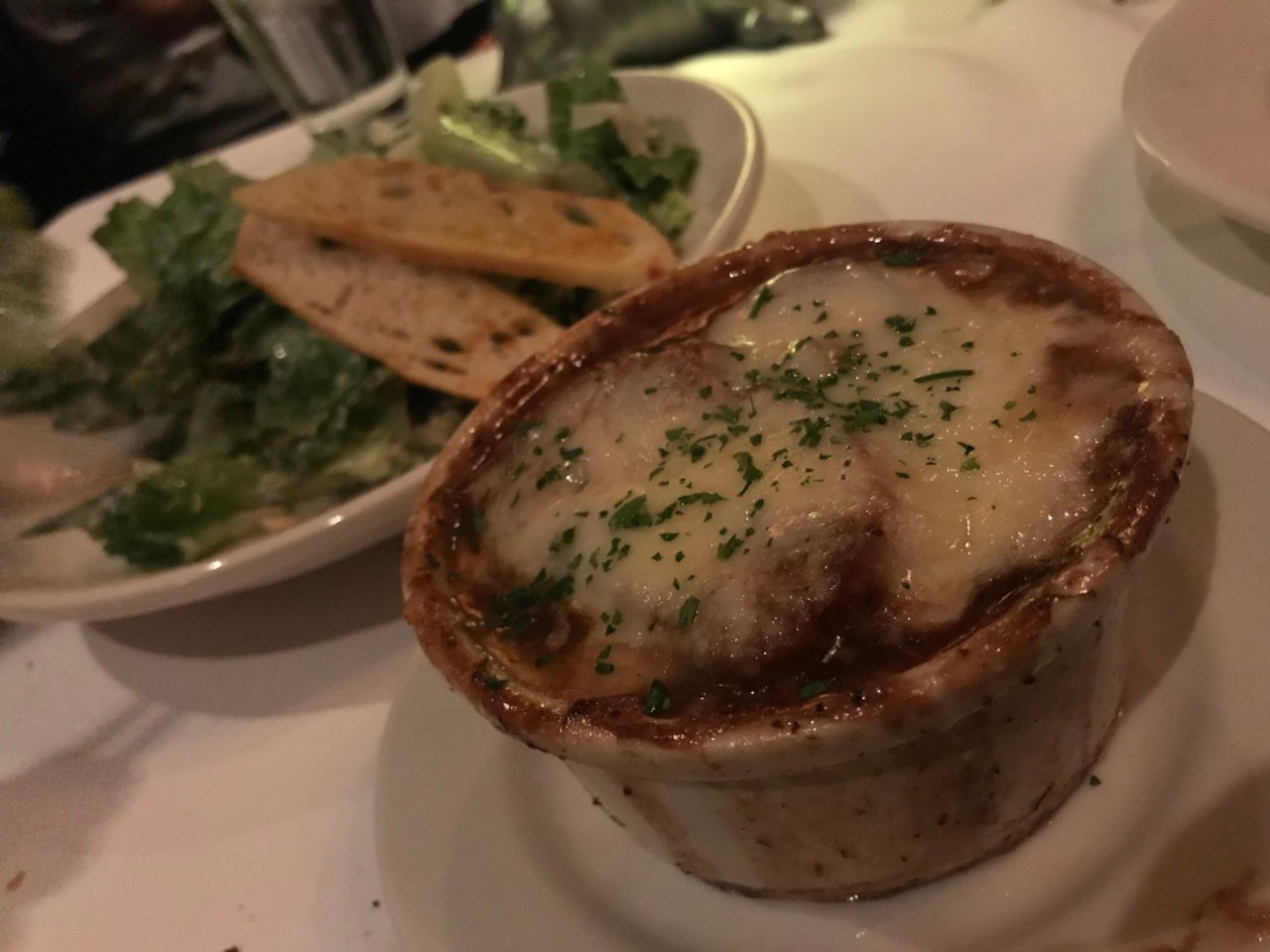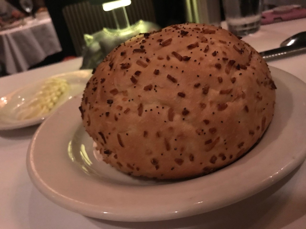 ステーキ、オニオンスープ、シュリンプ、ステーキを注文しました。最初にとても大きなパンがでてきましたが、パンについてるバターもおいしく、あっという間に食べてしまいました。
