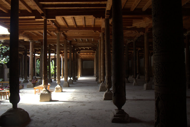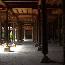 薄暗い、木の柱がならぶ不思議なモスクと、ミナレットがあります。