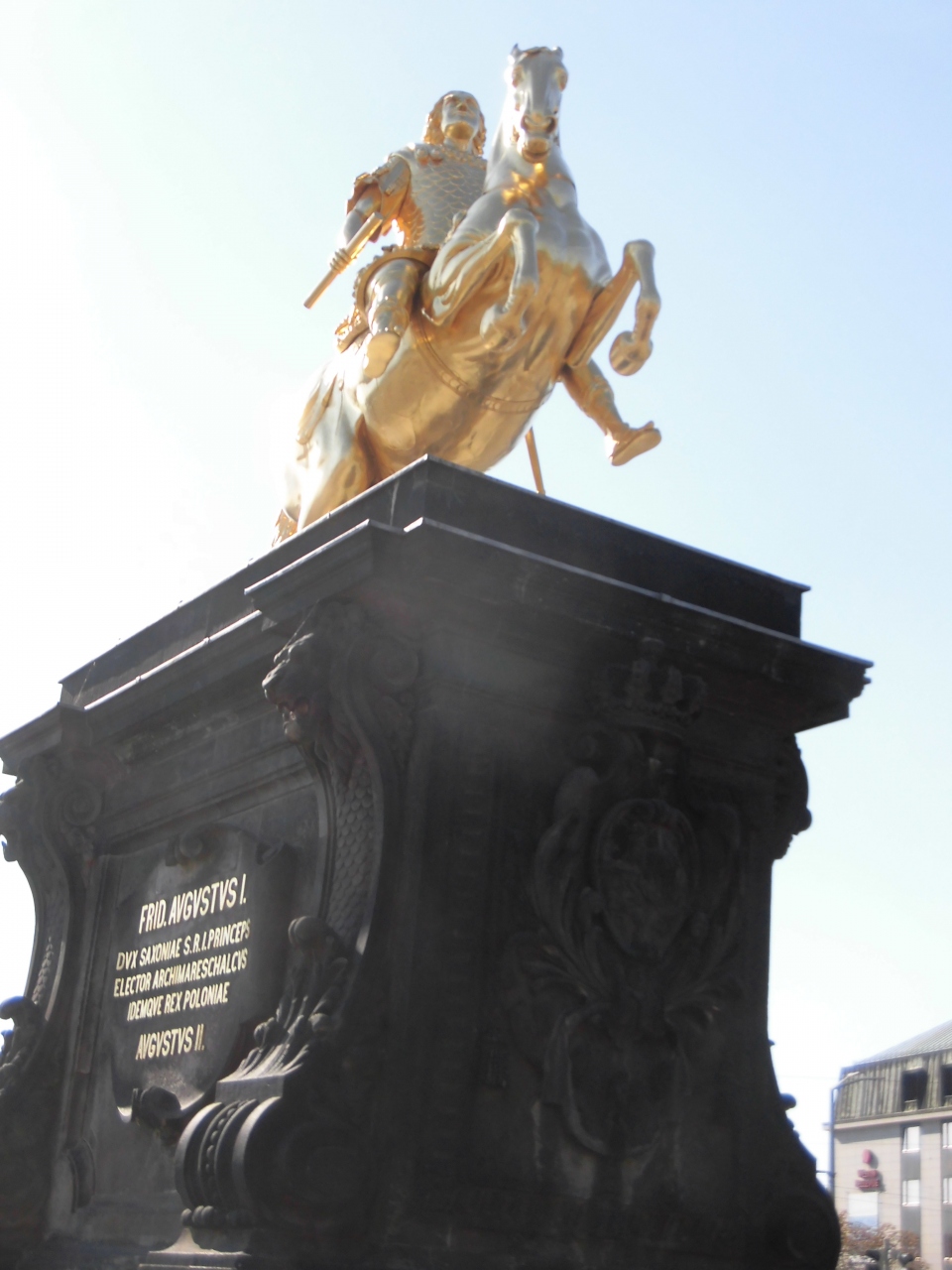 ドレスデンの旧市街からエルベ川にかかる「アウグスト橋」を渡った先に、金色に光り輝く騎馬像が見えてきます。 とても大きいので、遠くからでも良く見えます。