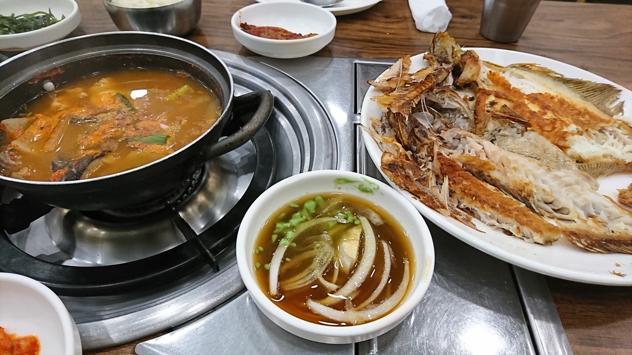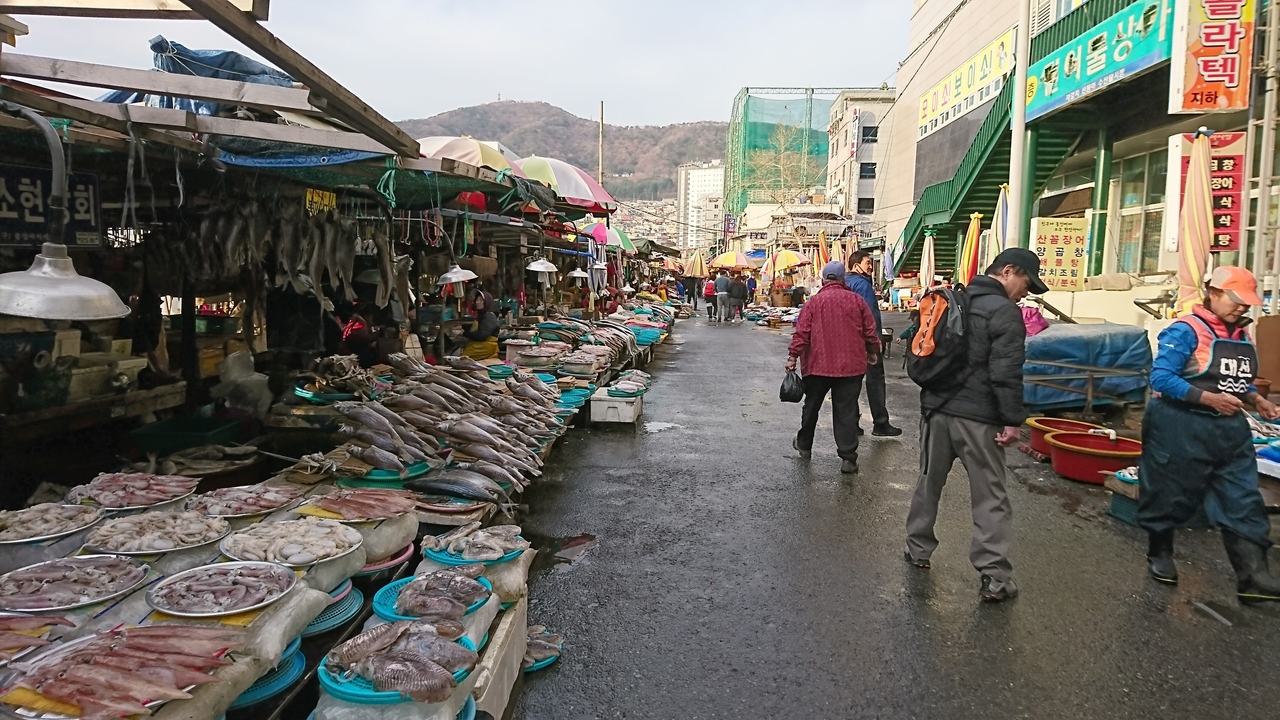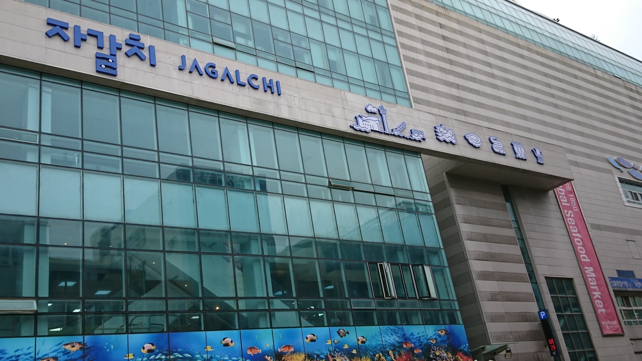 チャガルチ市場はホテルから近く、朝ご飯を食べに行きました。建物のなかがチャガルチ市場だと教えられて入りましたが、海鮮は食べなかったです。建物の外にお店を出している中から、7000ウォンで焼き魚を食べました。