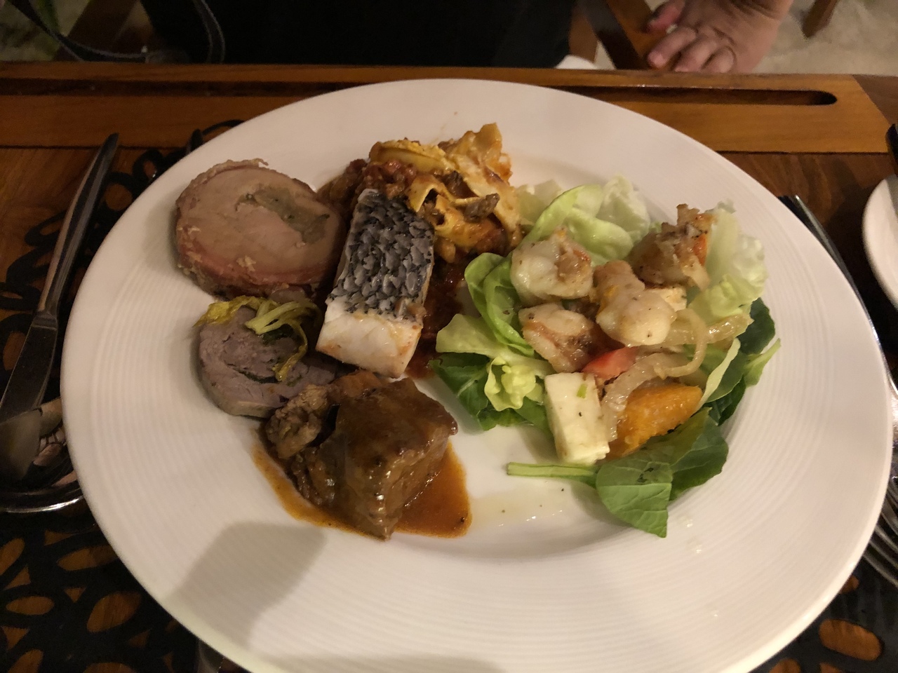 ビーチを見渡すプールサイドにあるメインレストラン。サンドカーペットのテラス席もあります。ブッフェ形式で毎日テーマが変わります。滞在時は以下のとおりでした。