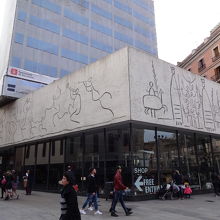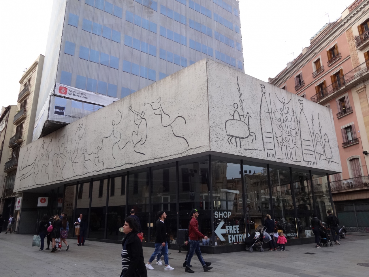ランブラス通りからプルタフェリサ通りCarrer de la Portaferrissaに入りちょっと進むと、観光スポットとして人気を集めている正面上部にある通称「ピカソの壁/壁画Picasso Wall」(カタルーニャ建築家協会)。パブロ・ピカソがカタルーニャ地方の民族舞踊「サルダーナ」の様子を描いたものだが、完成当時は「子どもの落書きにしか見えない」ということで、大きな議論を巻き起こした装飾だったが、今では世界中からこれを見に訪れる観光客が絶えなくなっているとのこと。観光客などが多く行き来する広場にあるため、白地に掘り込んだピカソの壁は、周囲の光景の中にまぎれていたので、うっかり見過ごしてしまうところだった。