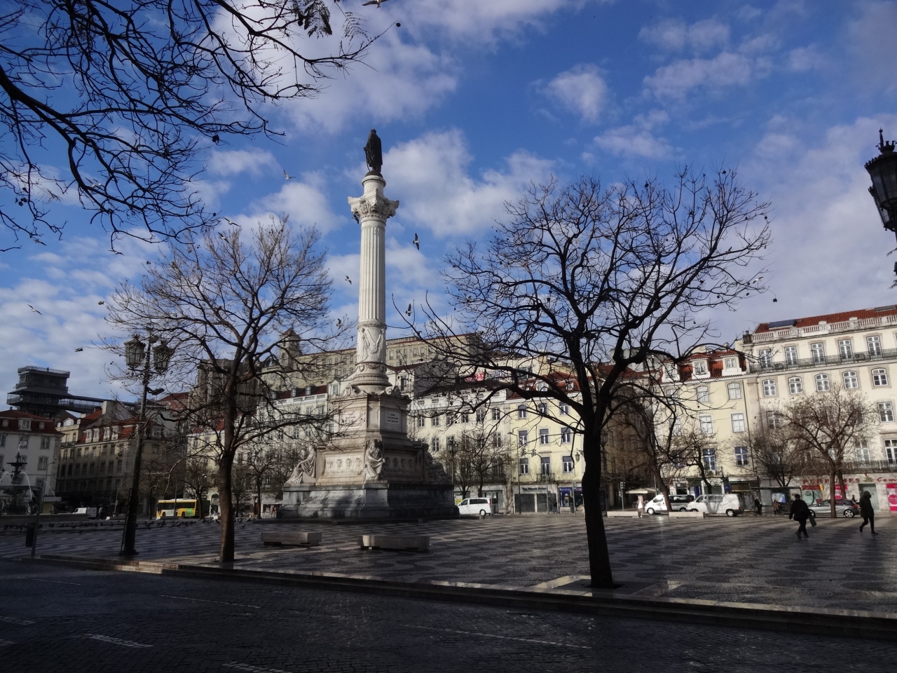 ここは、鉄道や地下鉄の駅、バス停などが集まるバイシャの中心。ここを最初に訪れたのは、シントラSintraに向かうためで、地下鉄から鉄道駅のロシオに。正式名称はペドロ4世広場だが、ロシオ(公共広場の意)の愛称で呼ばれていて、中央円柱の頂には初代ブラジル皇帝を務めた国王ペドロ4世の銅像が立っていた。また、奥の方には、サンタ・ジュスタのエレベーターElevador De Santa Justaも見てとれた。