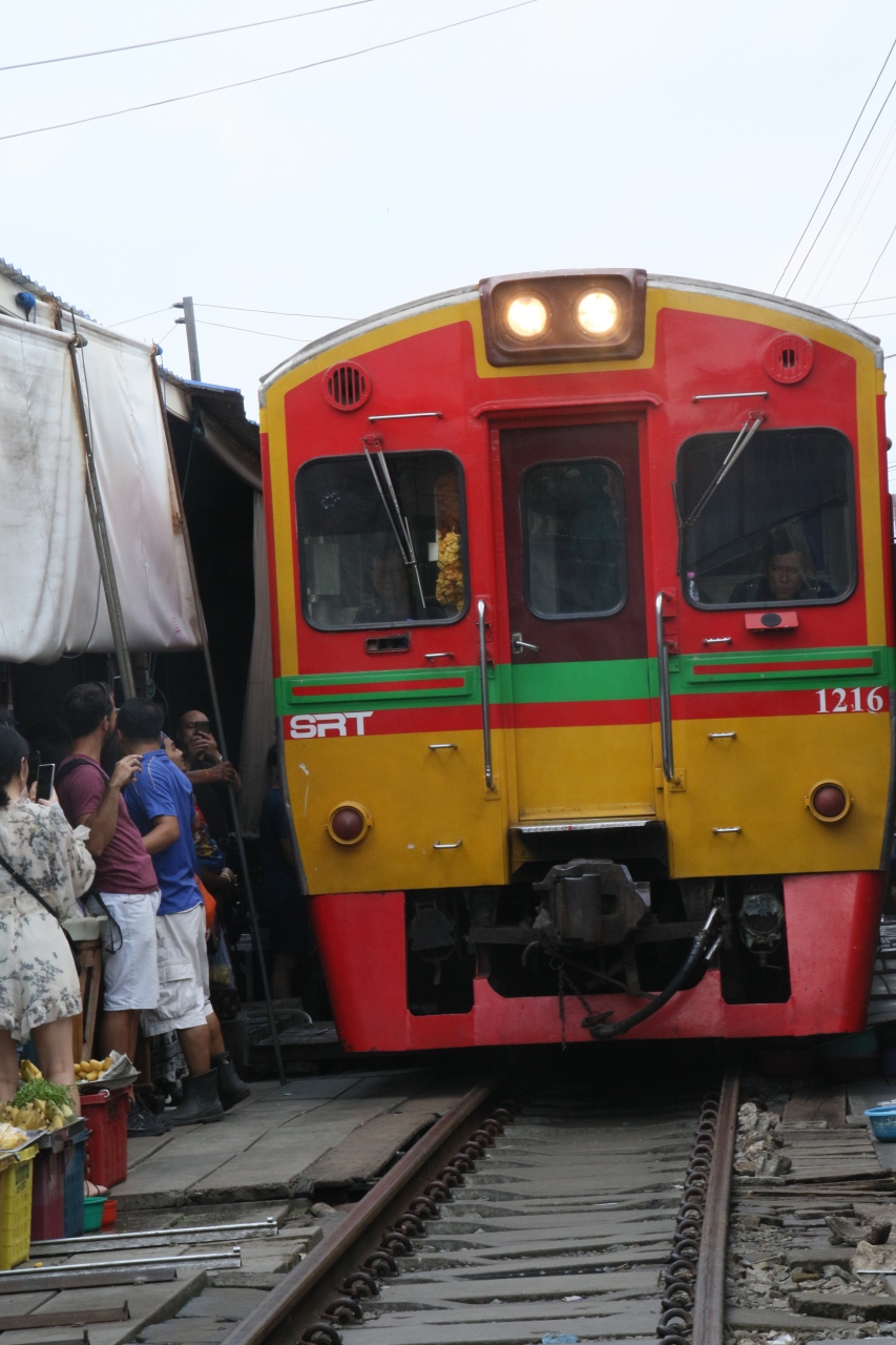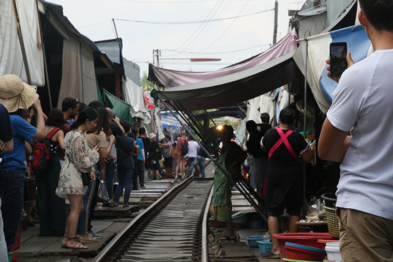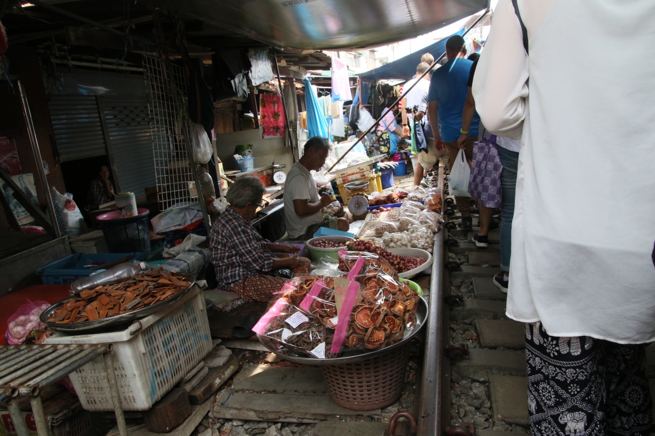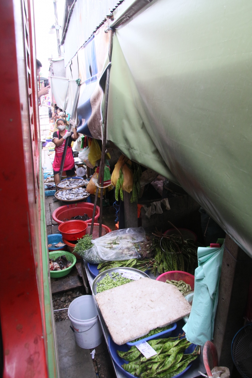 メークローン線の後半、バーンレーム駅からローカル単線でのんびり道中、からの最後の踏切を越えると一気に緊張感が発生します!列車から見下ろす市場の光景は予想以上に迫力があります。店の人は一歩も引き下がりません。