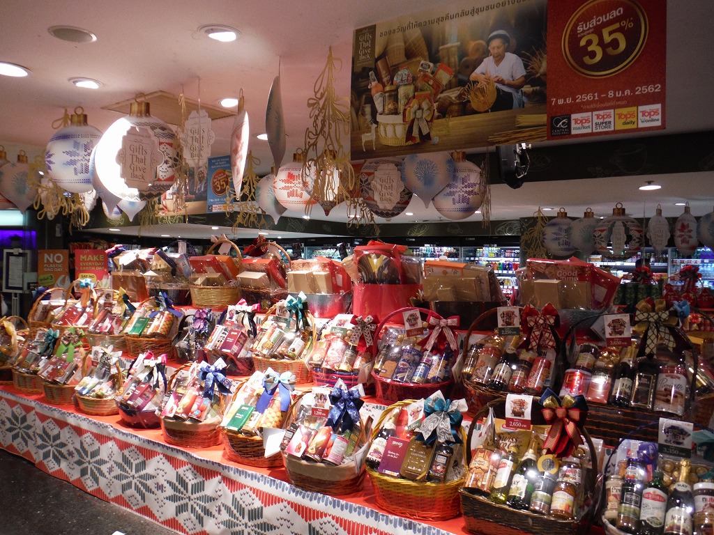 11月中旬に行ったら、おかしやジュースなどを詰め合わせた贈り物を売るコーナーができていました。 冬でも暑いタイに来ると季節感がなくなってしまいますが、このようなコーナーやクリスマスの飾りつけを見かけると、もうじきクリスマスが来て、年が変わるということを思い出します。