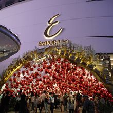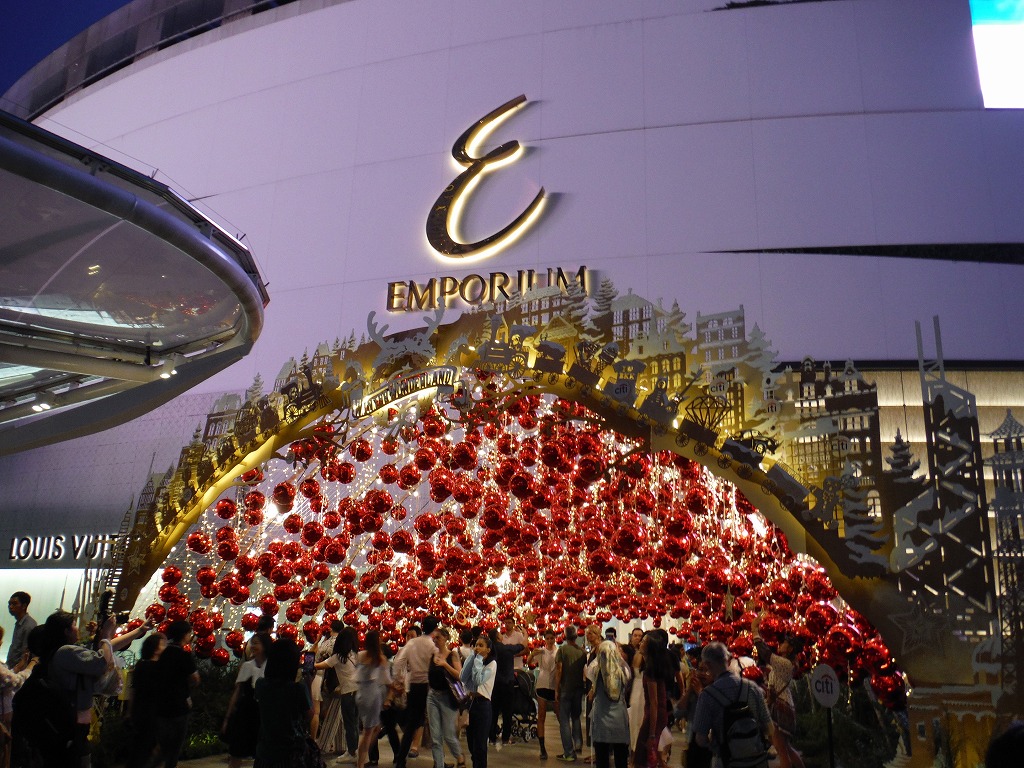 11月中旬に行ったら、すでにホリデー用の飾りつけがされていました。 店内のいろいろな場所にクリスマスツリーが置かれ、きれいな電飾などもありました。 プロンポン駅からの入り口には無数の真っ赤な球体がぶら下げられたアーチがつくられていて、多くの人が楽しそうに写真を撮っていました。