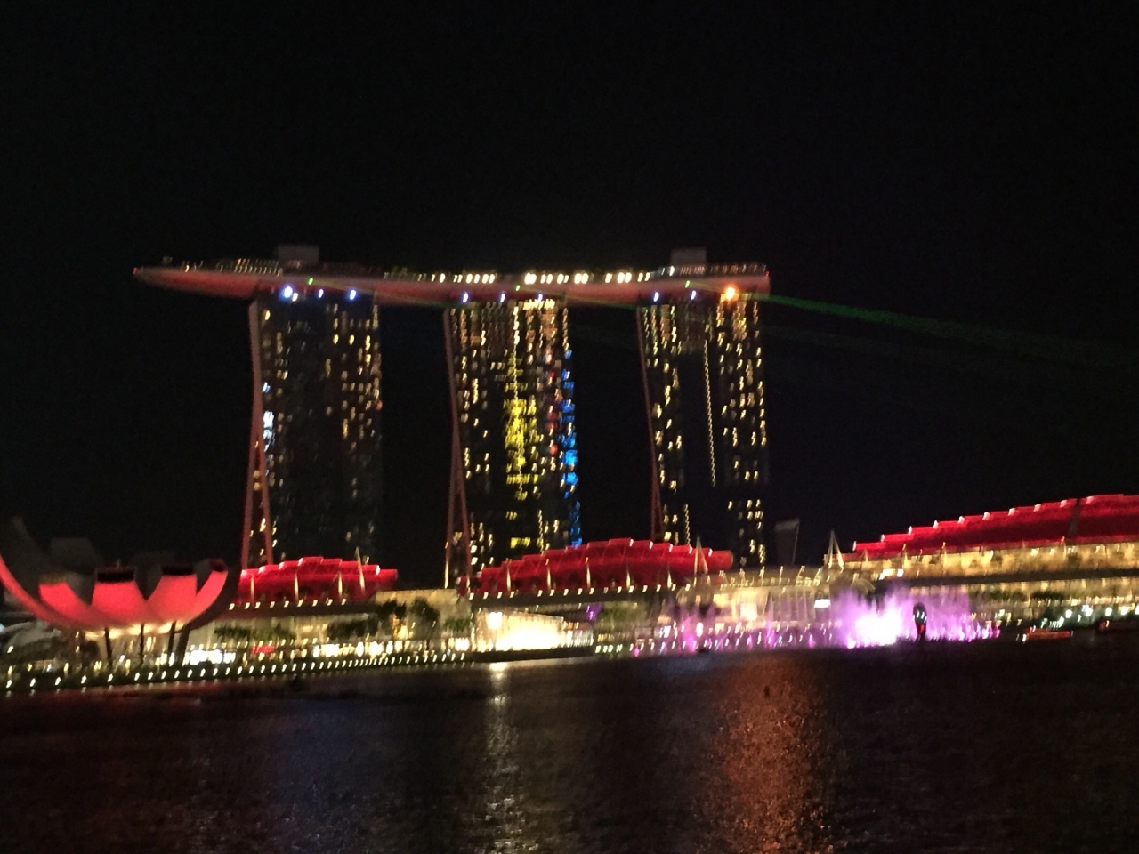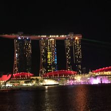 マリーナベイサンズのマリーナ湾側で毎日行われています。光と噴水のショーでじっくり見るには場所取りが必要です。ダイナミックな噴水のショーも良かったし、別日にマーライオン公園から見たマリーナベイサンズからの光や色かいろいろ変わるのもとても素晴らしかったです。