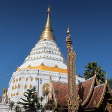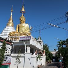 お堀側の入り口から入ると、金色の大仏が平屋の建物の屋上にのっていて、その後方に白い仏塔があります。白い仏塔を守るように立つ2本のプレートには、北タイの十二支のお寺の仏塔があしらわれているようでした。