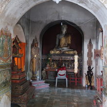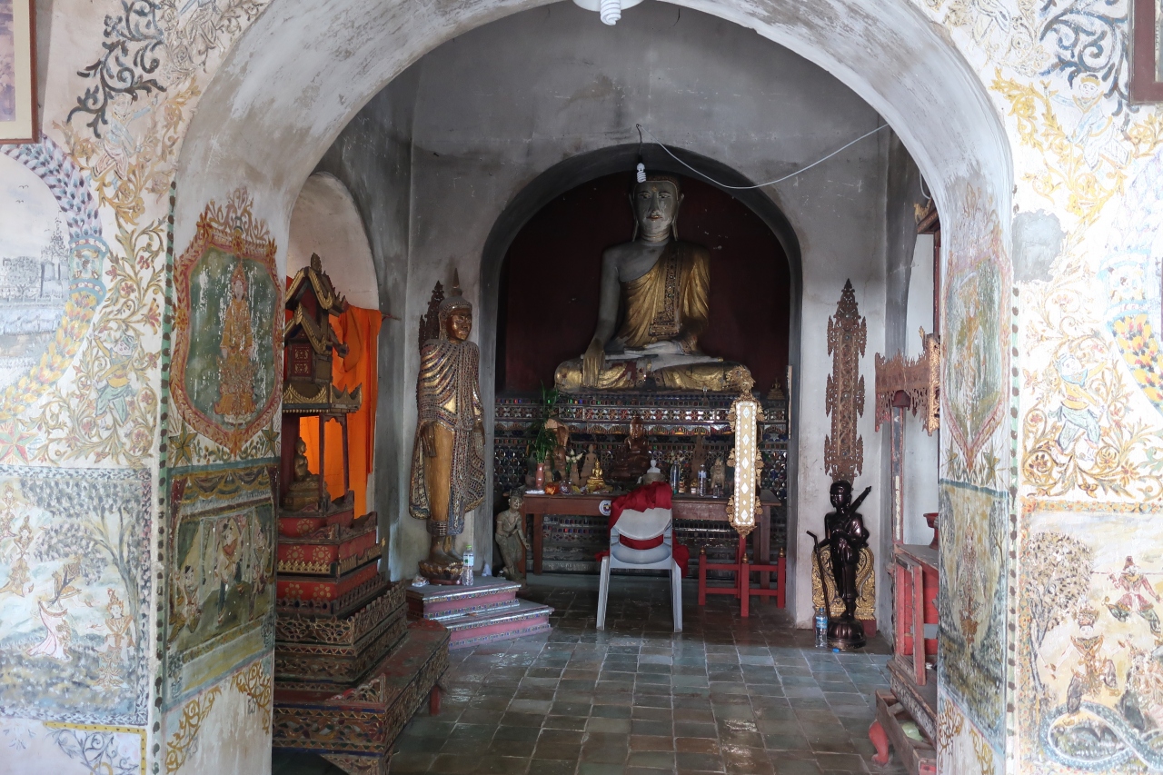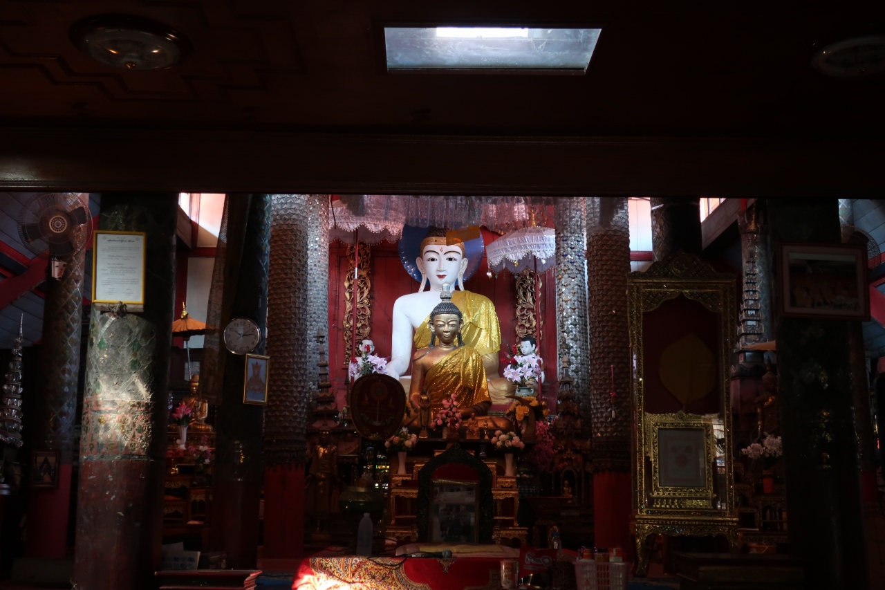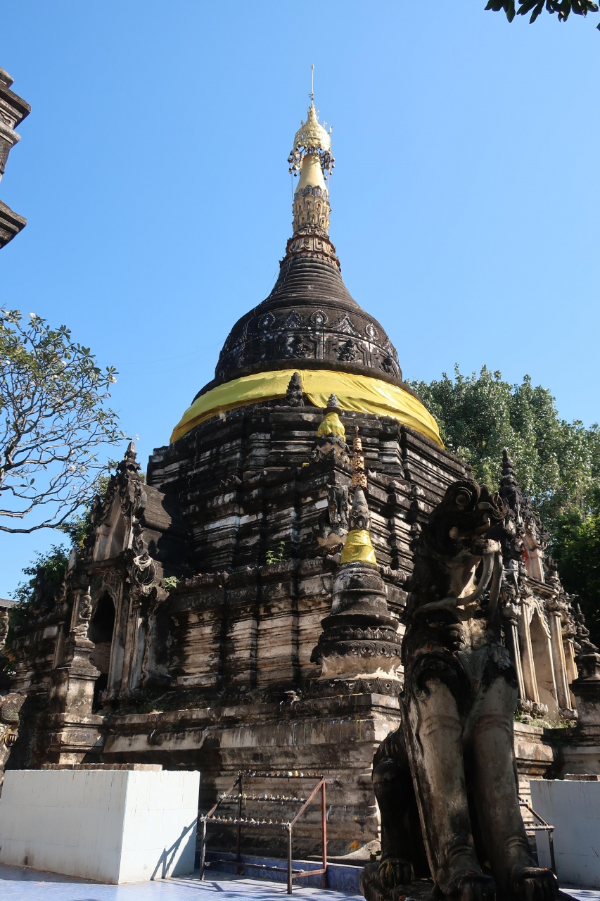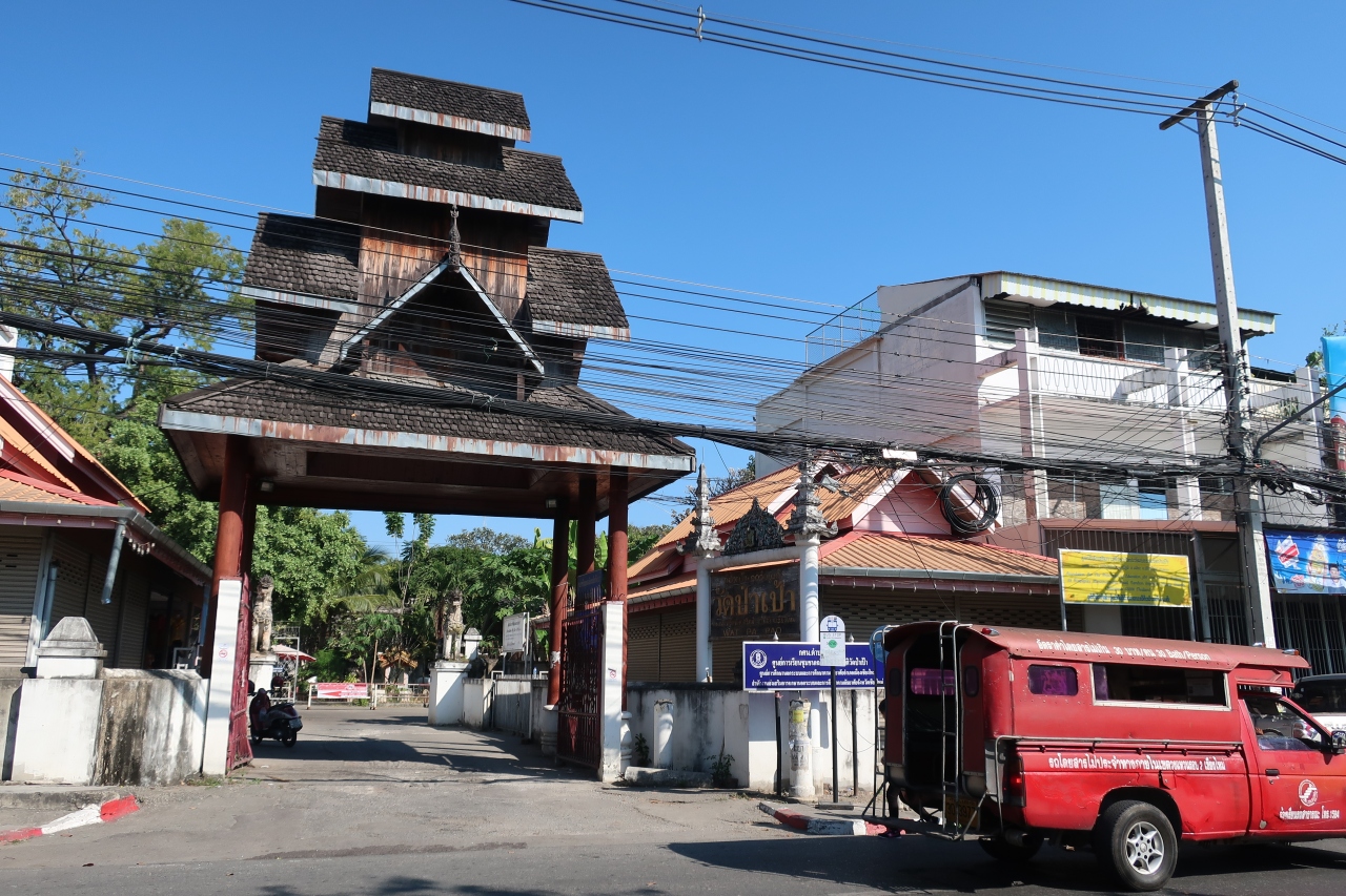 シャン(タイヤイ)族と関係の深いお寺とのことで、仏塔も建物もミャンマーのものに似ています。タイ語の表記に加えて、ミャンマー文字を使った表記(タイヤイ語かもしれません)が随所に見られました。門の屋根は他のシャン族のお寺と似たような構造になっていて、仏塔の横にある建物もミャンマーやタイのミャンマー国境の近くのお寺で見られるものとよく似ていました。あまり広くはありませんが緑が多く、ひっそりとした雰囲気でした。