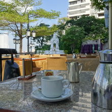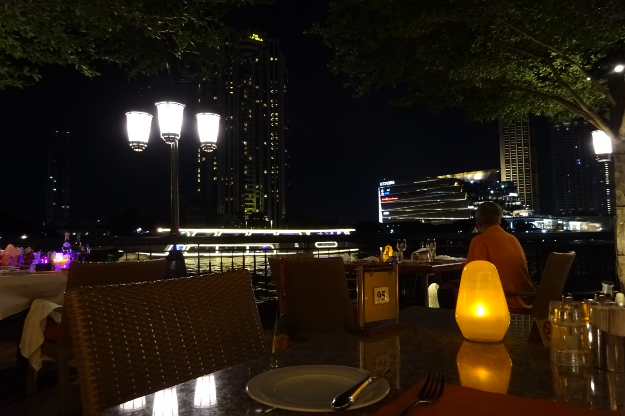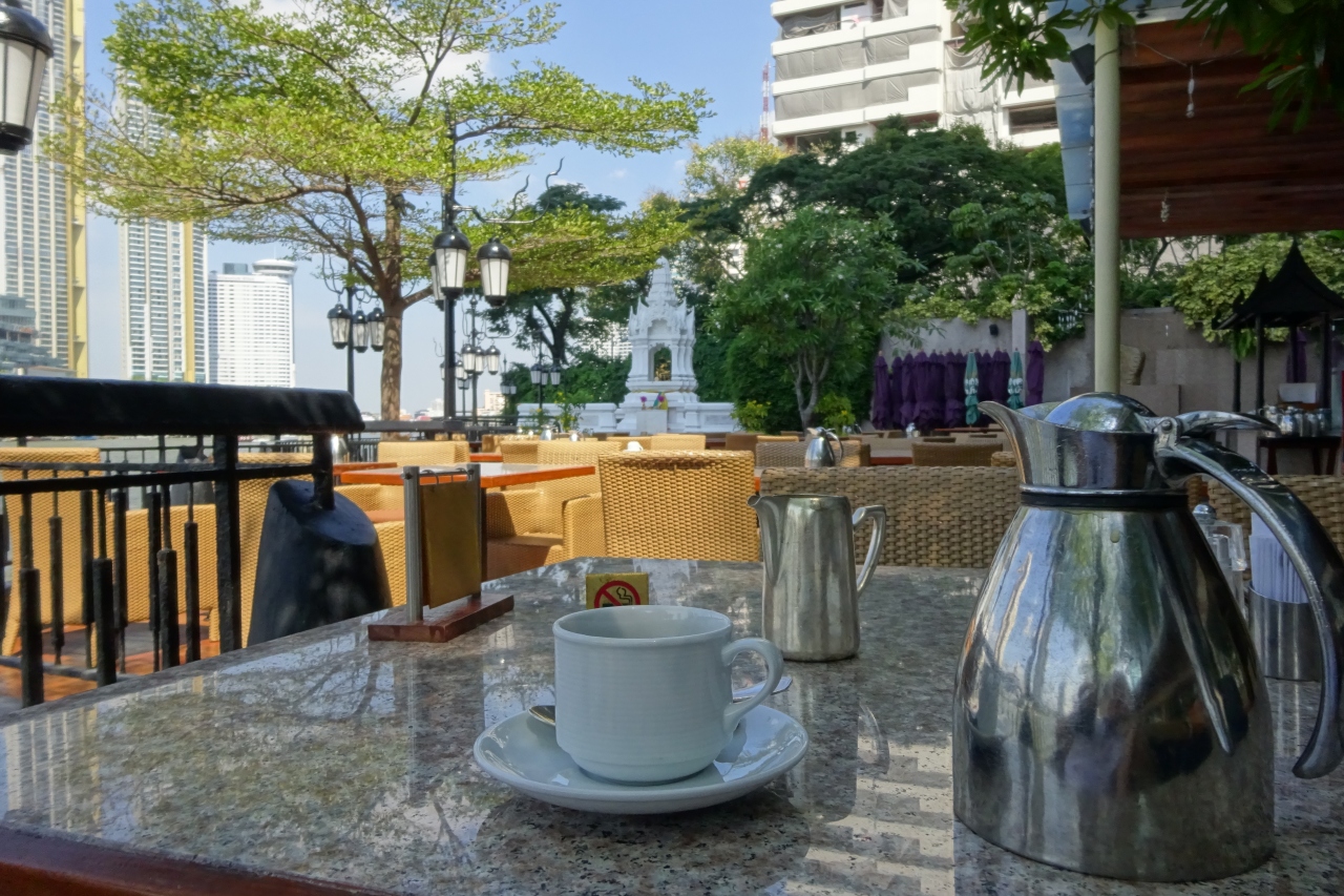 シャングリラホテルにあるカフェレストランです。チャオプラヤー川をながめながらコーヒーが飲めます。朝は朝食レストランです。夜、ライトアップされた船が行きかうのをみるのも素敵です。季節の良いときは外の席がおすすめです。