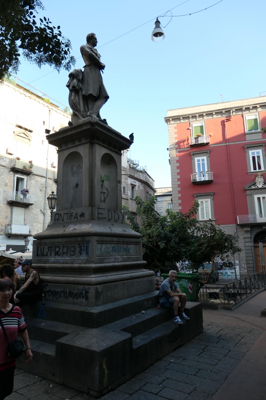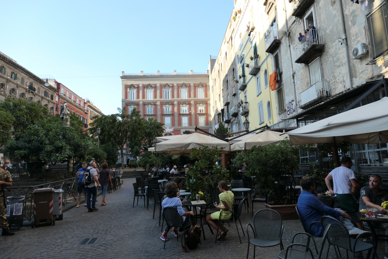 ベリーニ広場(Piazza Bellini)はスカッパナポリにある広場で木々も茂っていました。広場のレストランで観光客の皆さんが休んでいました。スカッパナポリは多くの人々で込み合った狭い通路が続きましたが、このような落ち着ける広場があり、ホッとした感じになりました。広場には古い遺跡もありました。「ナポリの壁」と呼ばれる古代の町の防御壁の遺跡です。紀元前の聖書戦争(BC218年-BC202年)の頃に建造されたのがこの遺跡の始まりだそうです。