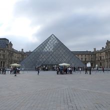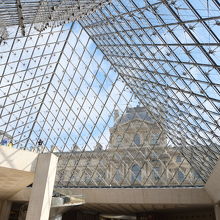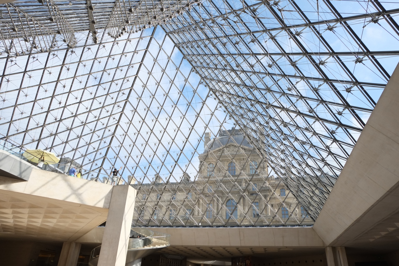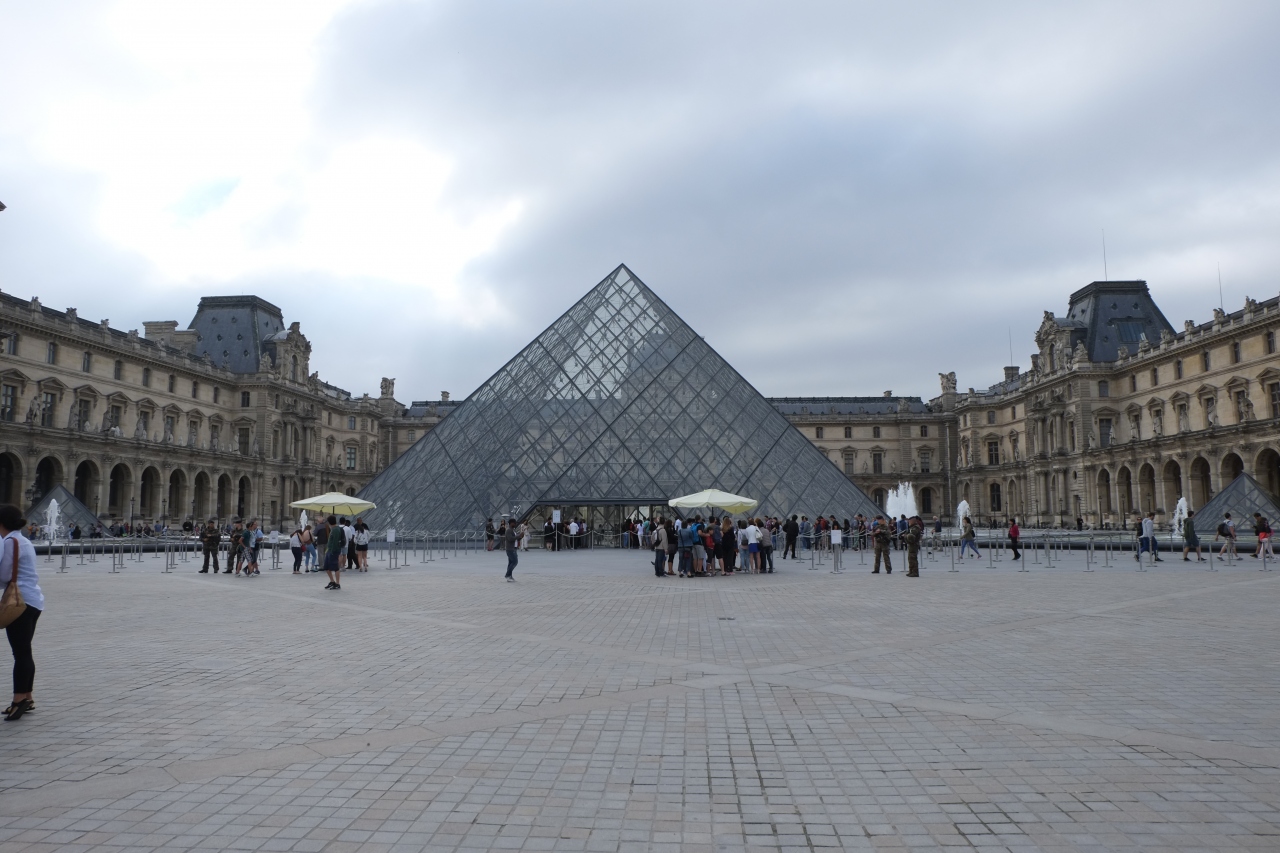 ルーブル美術館といえば、立派な建物に囲まれた広場の中央にガラス張りのピラミッド状の建物がある写真が有名です。古い建物とも意外と合う気がしました。ガラス張りの下は広いロビーになっていて、ルーブル美術館のチケット売り場などになっています。
