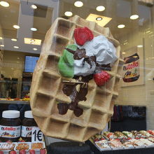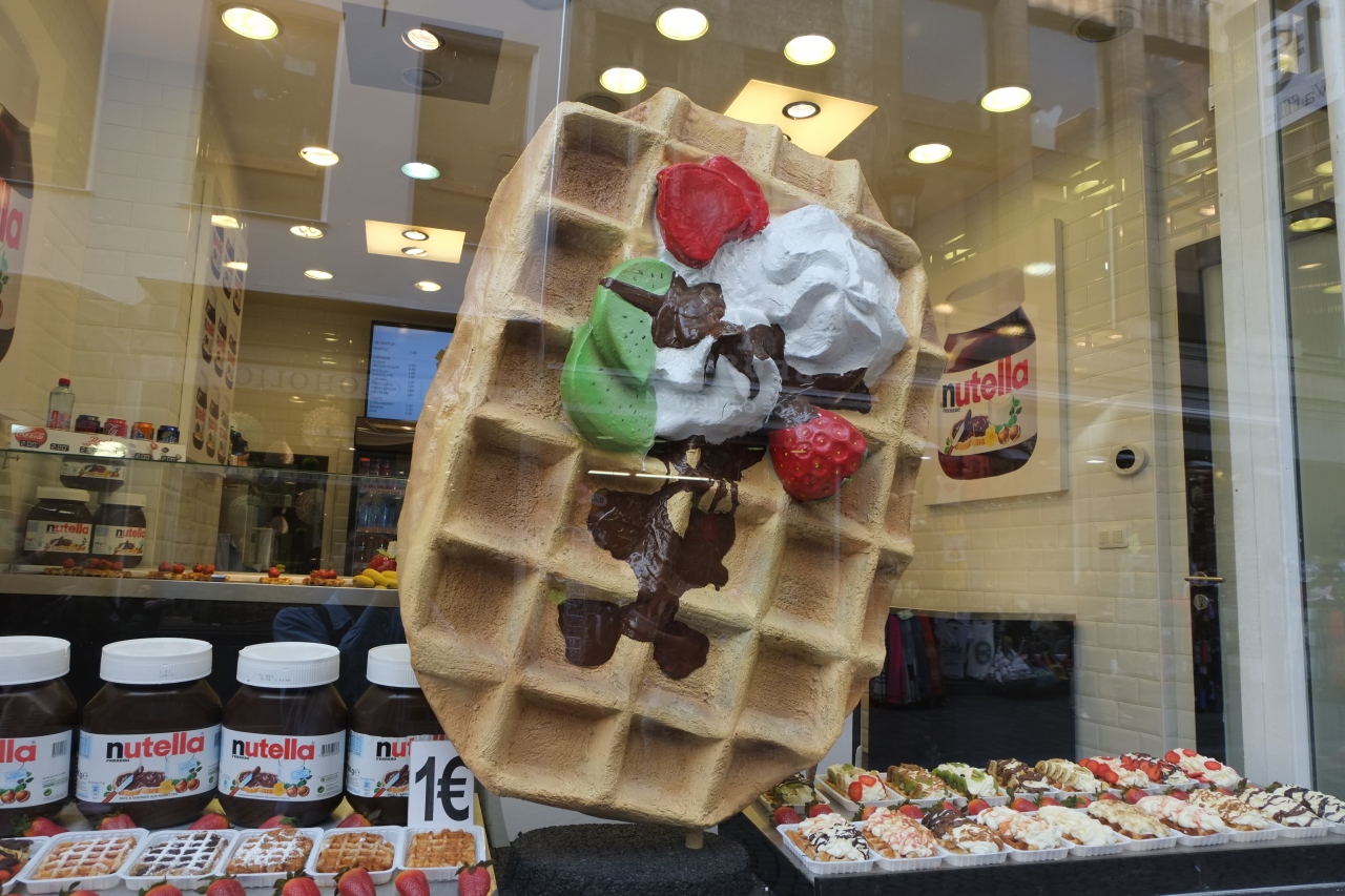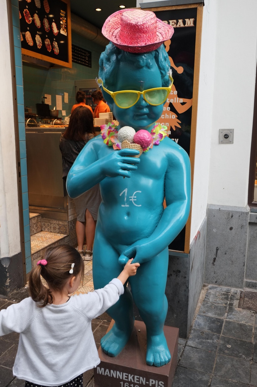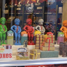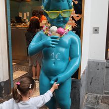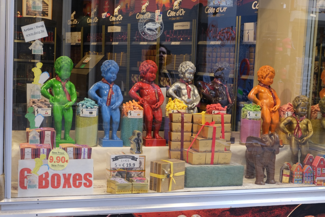 小便小僧の像とグラン・プラスの間にある通りで、観光客でいっぱいです。通りの両側には観光客向けの店が並んでいて、どこの店にも小便小僧の人形が並んでいます。お土産物店だけでなく、ワッフルやチョコレートの店も多いです。