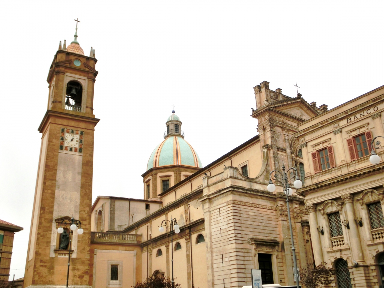 ノルマン時代に建てられた聖ジュリアーノ教会が、地震後に再建され、19世紀に大聖堂に昇格しています。カルタジローネ産の陶器で覆われた青いドームがとても印象的なカテドラルです。48メートルの鐘楼に付いている時計のまわりにも、マジョルカ焼きの飾り物が付いているように見えました。