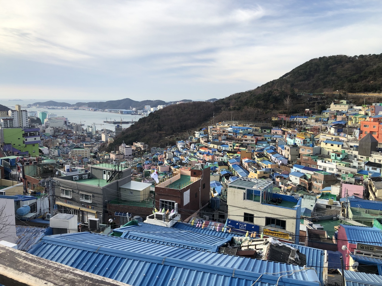チャガルチ駅からマウルバスで10分くらいで2番バスだと終点で下車すれば良いです。バス停周辺にはお店が結構あり、村の入り口から徒歩5分くらいで観光案内所と展望台がありました。展望台からは村一帯や釜山港が見渡せ、爽やかな気分になれました。