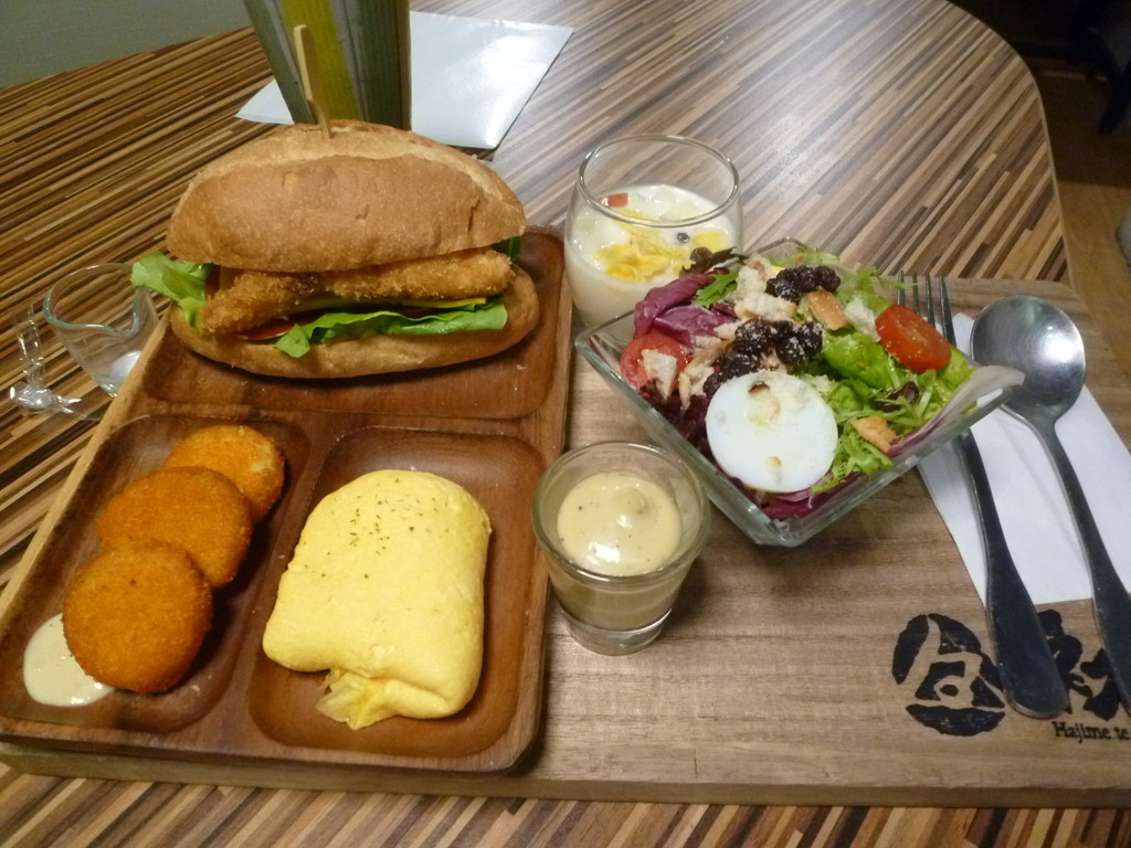 友人が今、Facebookで人気の「初めて・初日珈琲」の日本料理を見つけて、皆で行ってみました。雰囲気は、女子が好きそうな雰囲気で、店内は女子、若いカップルでいっぱいでした。雰囲気の良いお店で、珈琲が100元で飲めるので、皆さんのんびり寛いでいるように見えました。我々は食事に来たので、日本産のホッケ定食(450元)、おにぎり定食(320元)、豚肉のハンバーガー(320元)を注文し、シェアーしていただきました。予想していたよりは、美味しかったですが、値段は高かったですね。