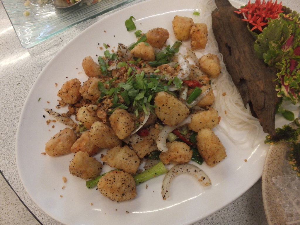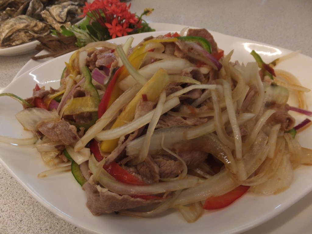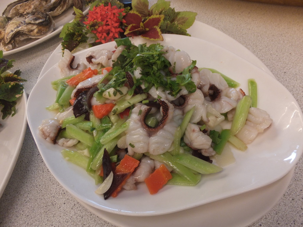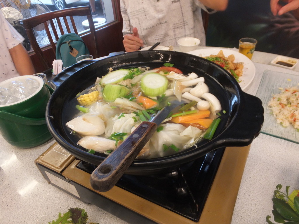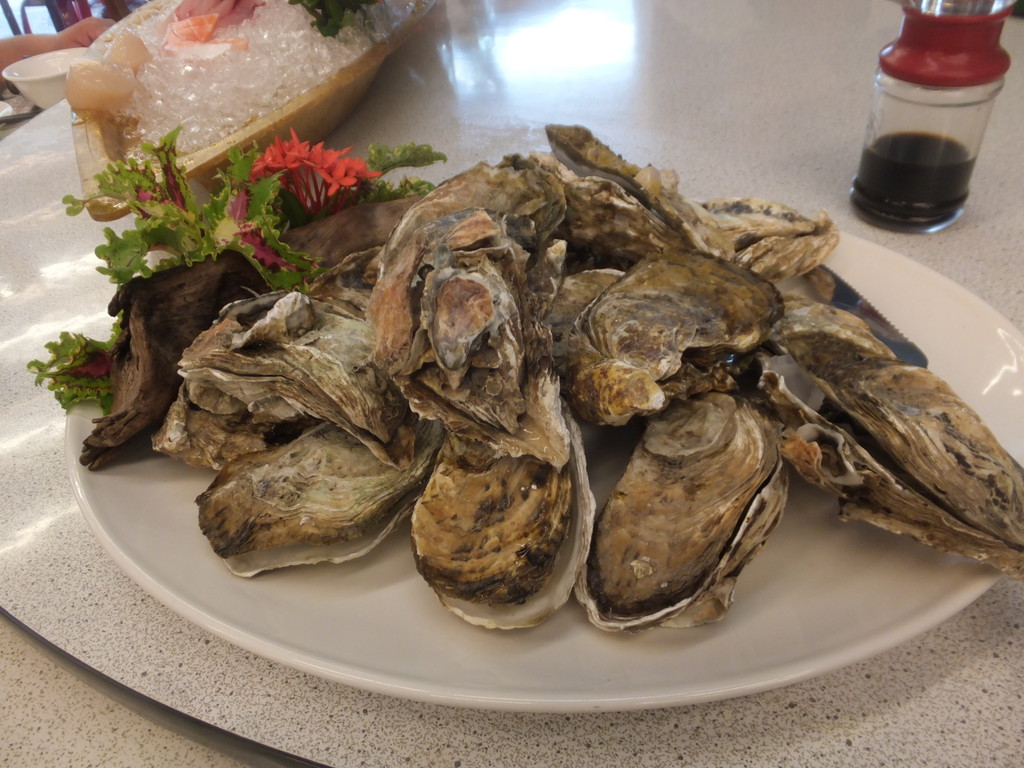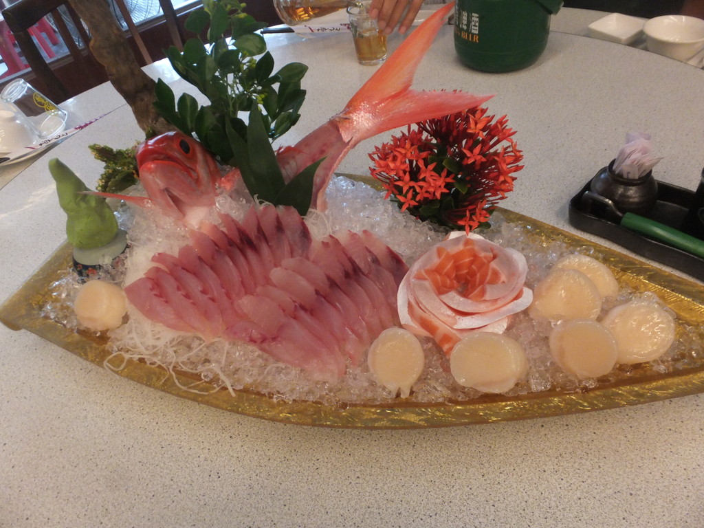 金目ダイに似た魚、ホタテ(これは冷凍もの)、サーモンの刺身、牡蠣、肉の野菜炒め、烏賊の野菜炒め、貝柱のから揚げ、炒飯、スーバンのしゃぶしゃぶ、エビ、これだけ食べて4,500元位。
