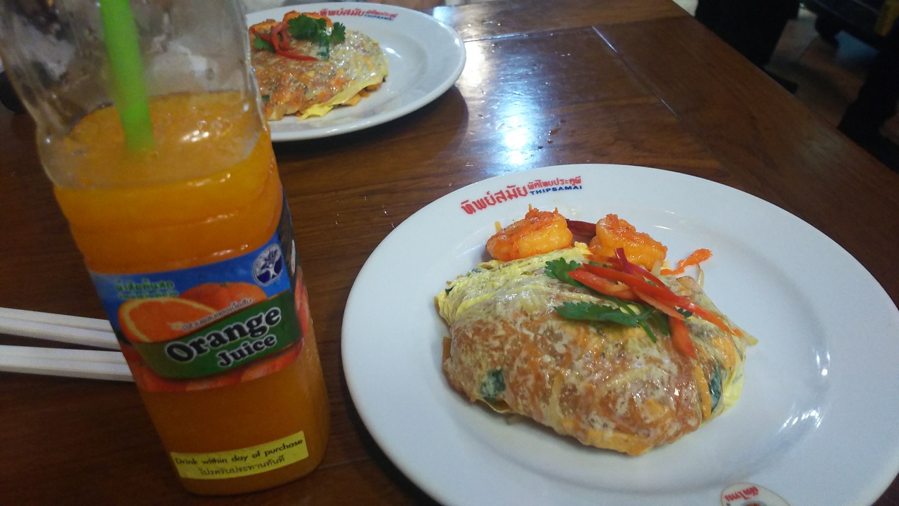 ちょうど夜ご飯の時間帯に行ったので、1時間くらい待ちました。待ったわりには、フードコートで食べるパッタイと同じくらいの感動でした。有名なオレンジジュースも美味しいんだけど高いなーという印象でした。持ち帰りなら列に並ばずにすぐに買えるようでした。