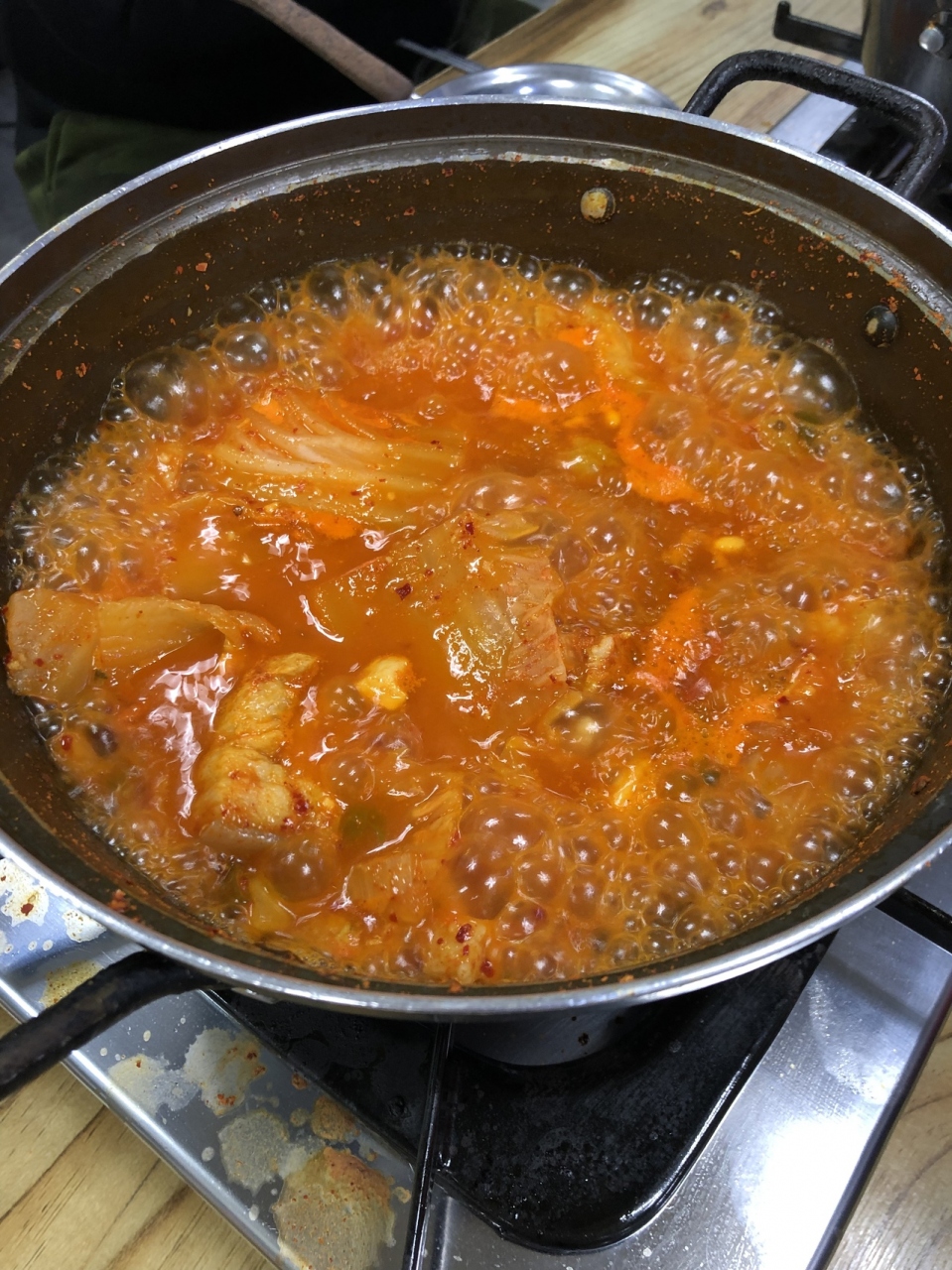 ソウル3大キムチチゲの一角と呼ばれる名店。おひとり様は敬遠されるとの口コミも多くみられるが、ピークタイムを外せば温かく迎え入れてくれる。週末、ランチのピークを過ぎた15時前に入店、店内は多くの客で活気づいている。すぐにキムチチゲの鍋が火にかけられ、ご飯セットとたっぷりの野菜が用意される。旅先では生野菜不足になりがちだが、韓国ではいつも以上に乳酸菌と生野菜が摂れる。ぐつぐつとたぎる鍋の仕上りをじっと待つこと15分、蓋が外されていよいよキムチチゲをいただく。煮込まれてとろりとしたスープは塩分もちょうどよく、豚肉はゴロゴロとして旨い。個人的見解ではソウル一のキムチチゲはココかな。たっぷりのサンチュといただけばほっこり幸せ気分が味わえる。