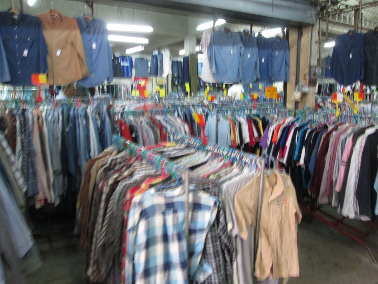 ソンバクホーイ市場1階の特設会場で衣服物の特売イベントが開催されていました。暑いチェンマイでは半袖シャツやハーフパンツでの服装がいいです。シャツとパンツは平均して、1枚100から150バーツ程度、Tシャツ・ポロシャツと生地の薄いタイプのハーフパンツは80バーツと激安でした。