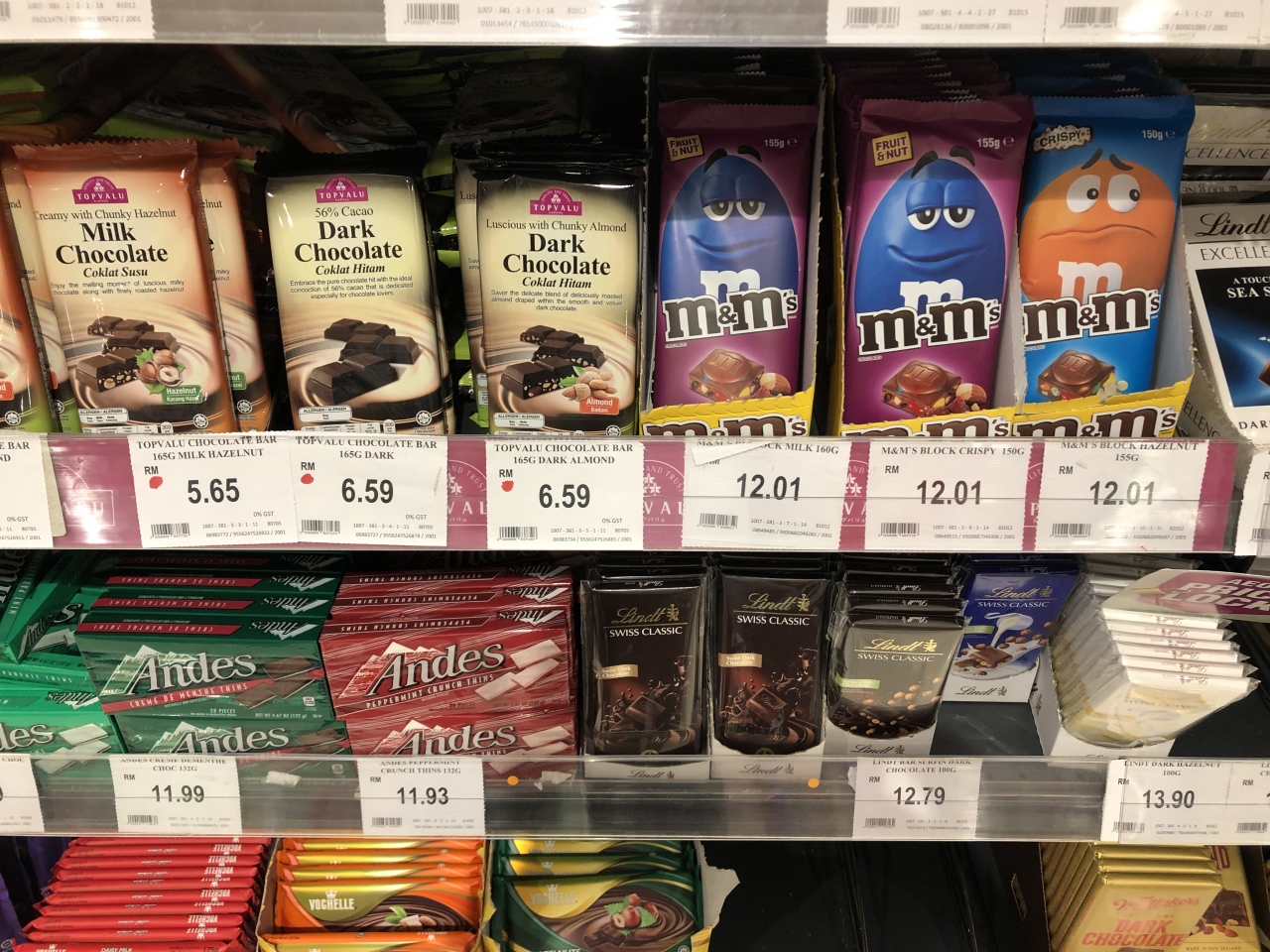 ミッドバレーメガモールを訪れた時にイオンがあったのでお土産を思い出し寄ってみました。見たのは主にチョコレートでPBのチョコレート一枚が6.59RM≒183円(税別)にもかかわらずちゃんとした味でバラマキ土産にもいいかと思います。