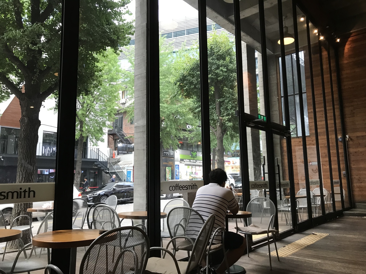 ソウルのオシャレスポットであるカロスキルにあるカフェ。外観からしていい感じですが、中も期待を裏切りません。2階建ですが、1階の方が通りを行き交う人達を眺めながらマッタリするのには良いと思います。テーブルに電源があるのでケータイのバッテリーを気にせず長居ができます。