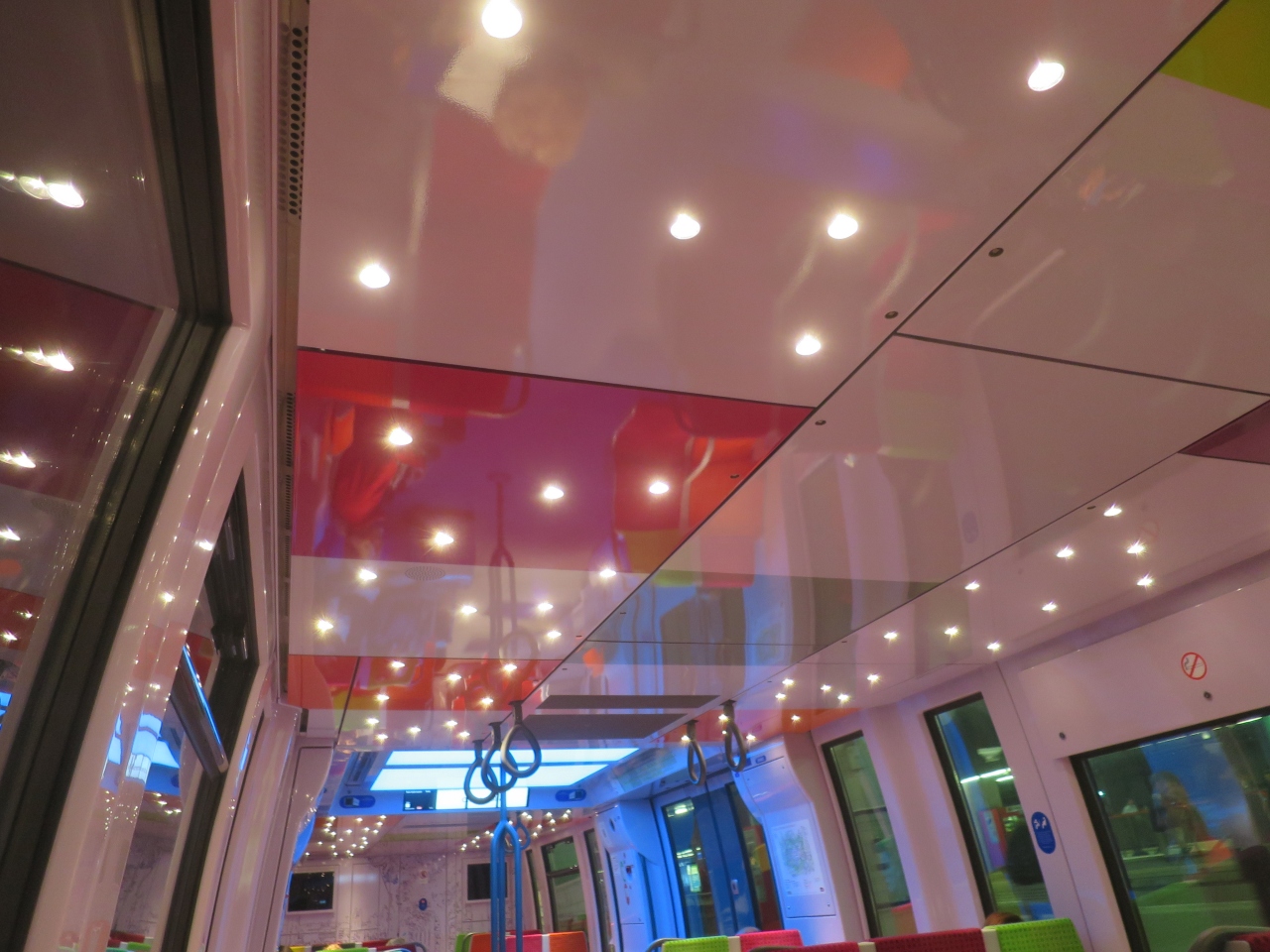 サンラザール駅から郊外へ向かう際に利用しました。SNCFの車両で落書きなどもなく車内もきれいなのですが、色使いが非常に鮮やかで日本ではあまり考えられない配色だと思いました。少々サイケデリックな感も否めません。