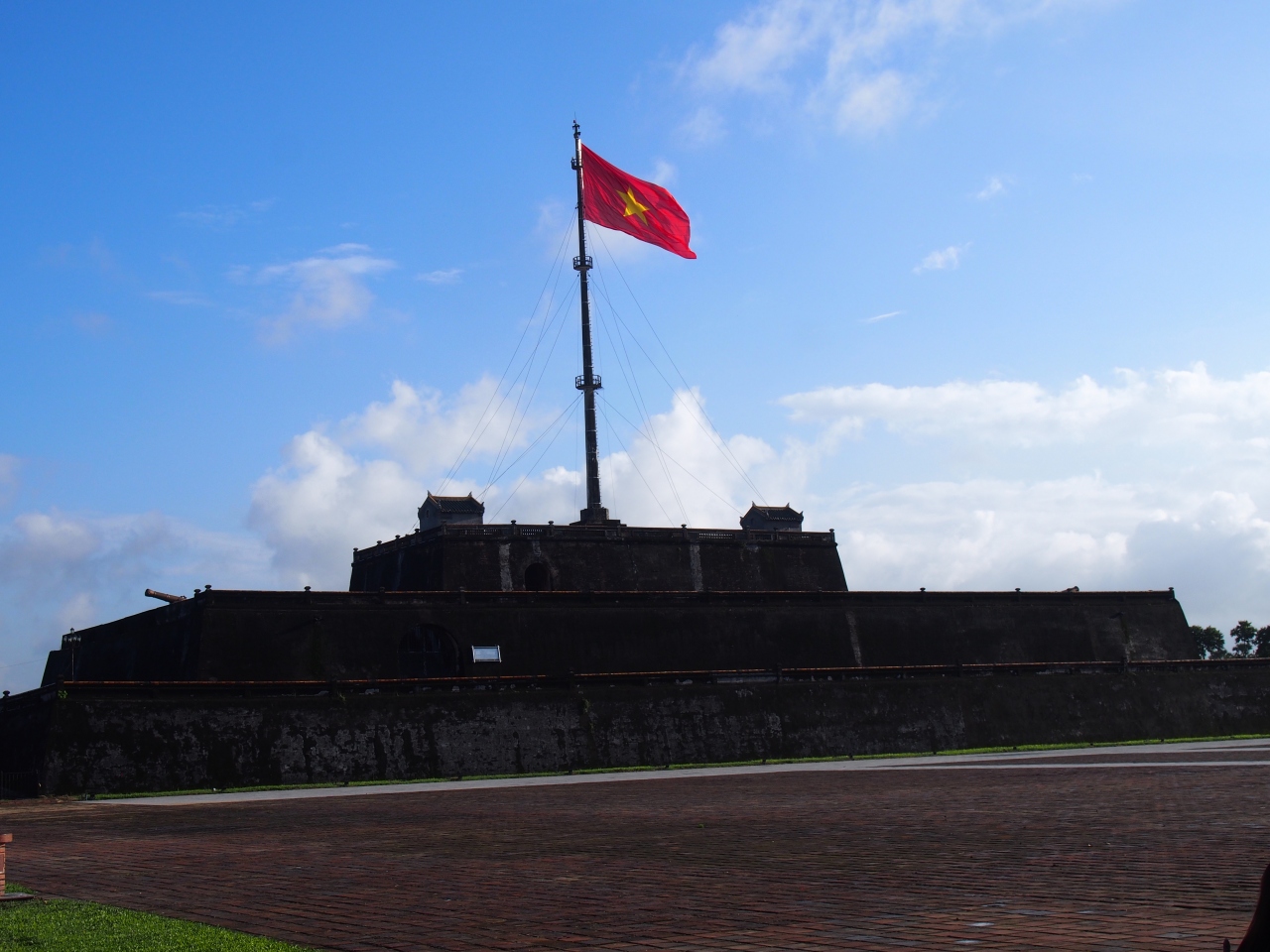 王宮の南側正門の近くにフラッグタワーはあります。グエン朝の第1代皇帝のザーロン帝の時代に築かれますが、戦争などで破壊され、第12代皇帝のカイディン帝の時代に再建されています。タワーは3層構造のコンクリートの土台でその上に旗が立っています。ベトナム国旗が風に閃いています。旗の両横には大砲が置かれています。ハノイ城にもフラッグタワーがありましたが、フエ城の方が立派です。