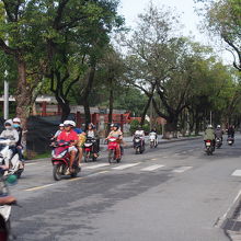 ホエ市街地のフォン川沿いの通りです。通りの片方は川沿いの緑地帯、公園になっていて、開放感がある通りです。反対側は家並がありますが、新しい街並みなので、ごみごみしていないので、きれいな街並みの感じがあります。通り沿いにはフエ中央郵便局、ホーチミンが卒業した高校などが並んでいます。またフォン川遊覧船の乗り場もあります。