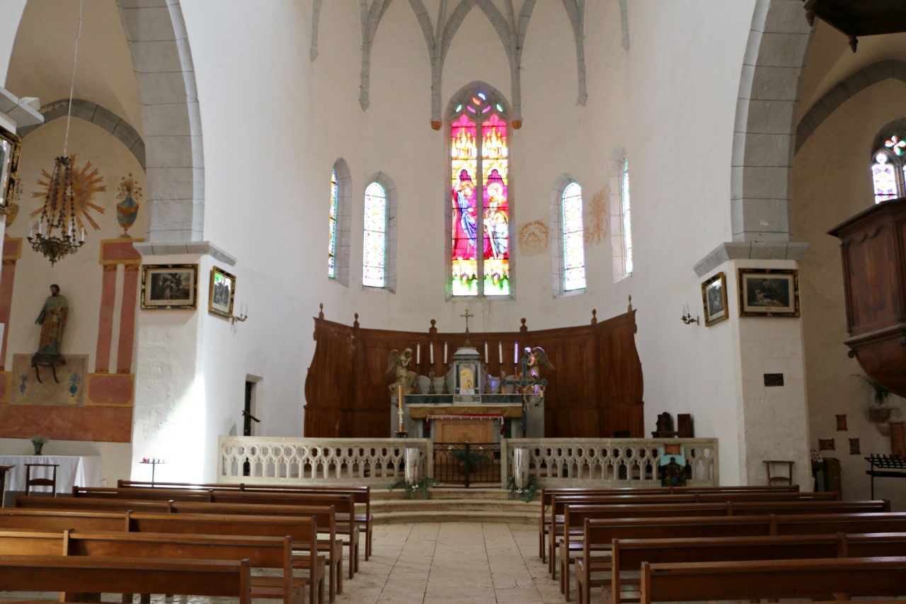 内部は三廊式で簡素な印象を受けますが、主祭壇の背後にあるステンドグラスには聖シルと母ユリッタが描かれていますので、ぜひ注目してみて下さい。