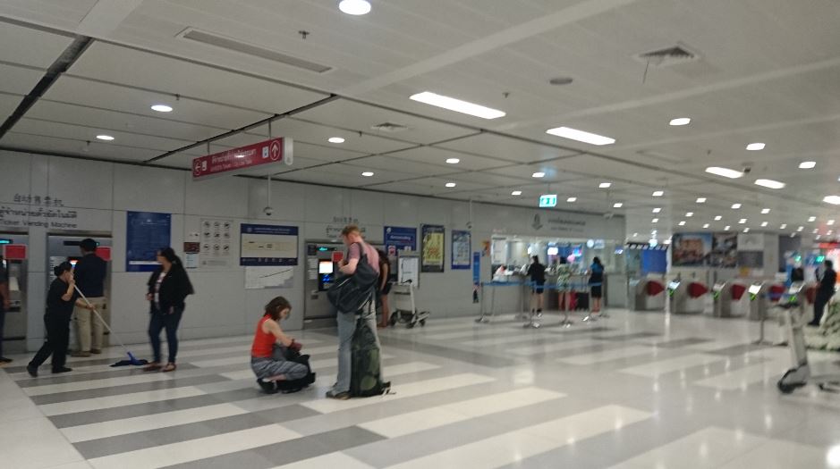 スワンナプーム国際空港の地下にあるARLの始発駅で到着ロビーからは無段差のエスカレーターでも下れます。切符売り場の手前には軽食出来るショップも数件ありました。早朝に到着しましたが朝6時が空港から市内の始発だったと思います。帰国時も利用しましたが通勤時間帯は結構混みます。