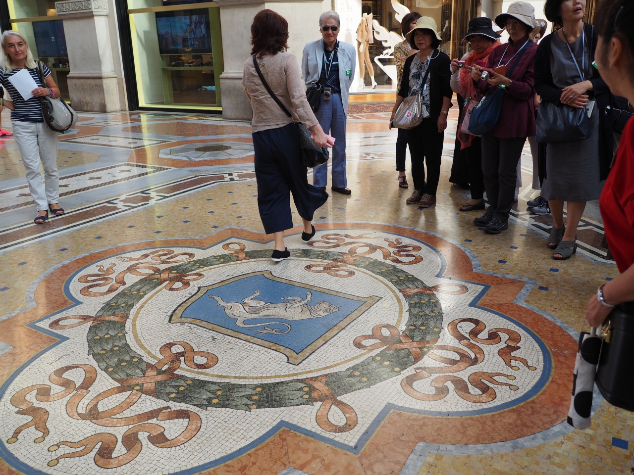 アーケード中央に青いタイルで囲まれた牡牛のモザイクがあり、急所に踵を付けて回ると幸せになれると言い伝えがあるとガイドさんに促され回って来ました。