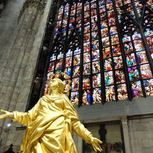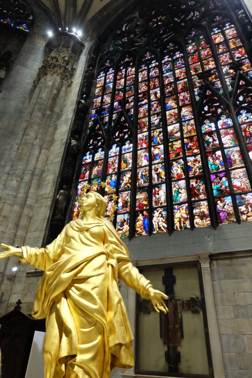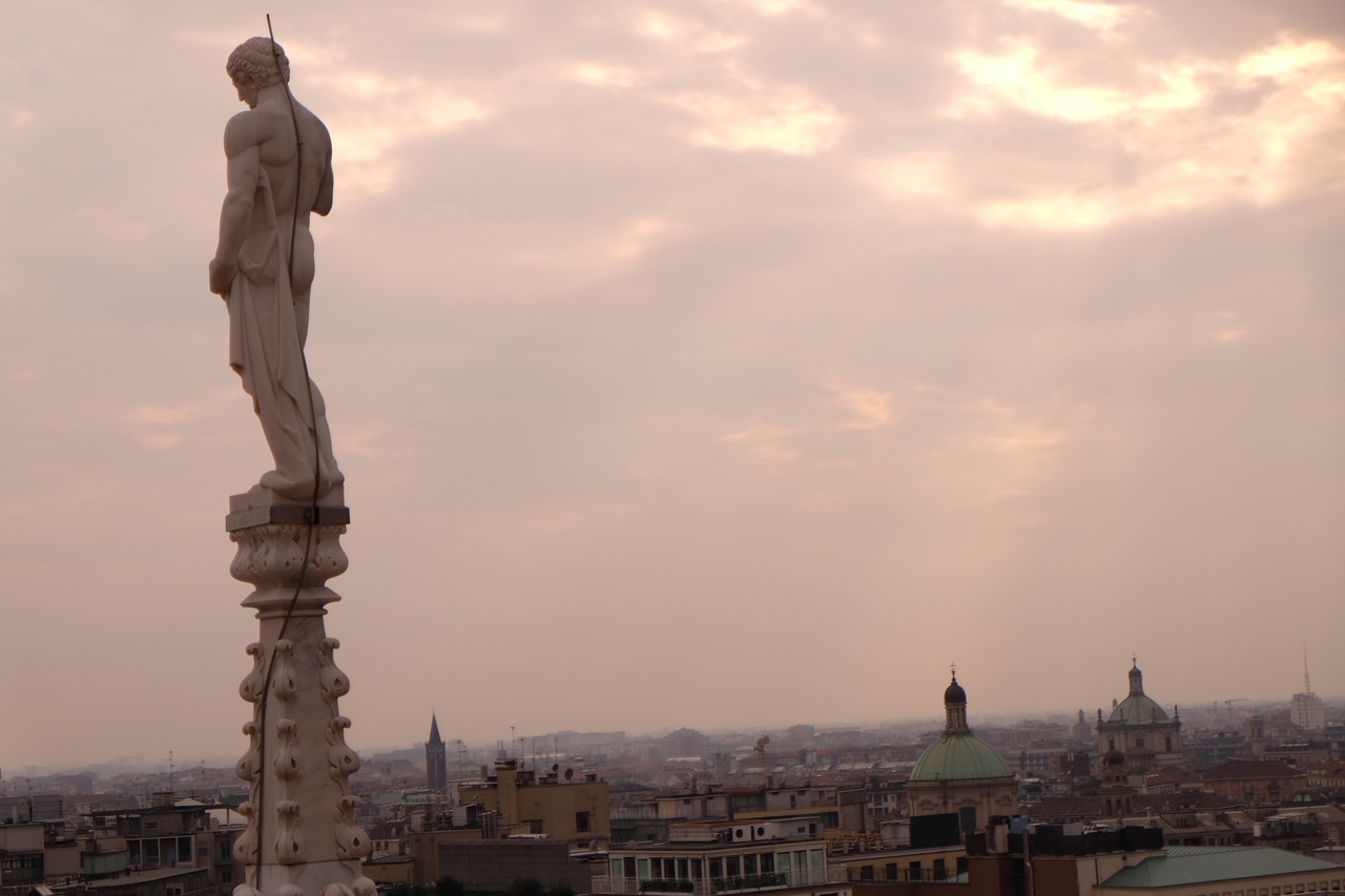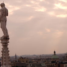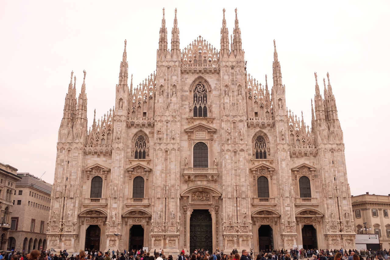 ミラノのガッレリアの通りを抜けると、ミラノのドゥオモが見えてきます。とても立派できれいな建物で、屋根には135本の尖塔があり、尖塔の先のひとつひとつには聖人が立っているそうです。チケットを買えば中にも入ることができ、正面にあるステンドグラスは世界一の大きさだそうです。チケットとは別料金になりますが、エレベーターで屋根の上に登ることもできます。尖塔の先の聖人もより近くで見ることができ、景色もいいのでとてもよかったです。