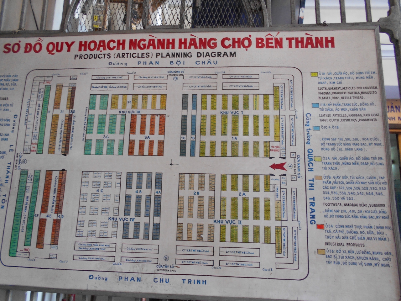 場内は、中央に広い通路があり、両脇に非常に細い通路が碁盤のようにあり、様々な小さなお店が沢山並んでいます。場内は、非常に広くて何処を見たか、何処を歩いたか分からなくなってしまいますが、広い通路を見つけると中央に戻る事ができます。案内図もありましたが、当然ながらベトナム語は解りません。