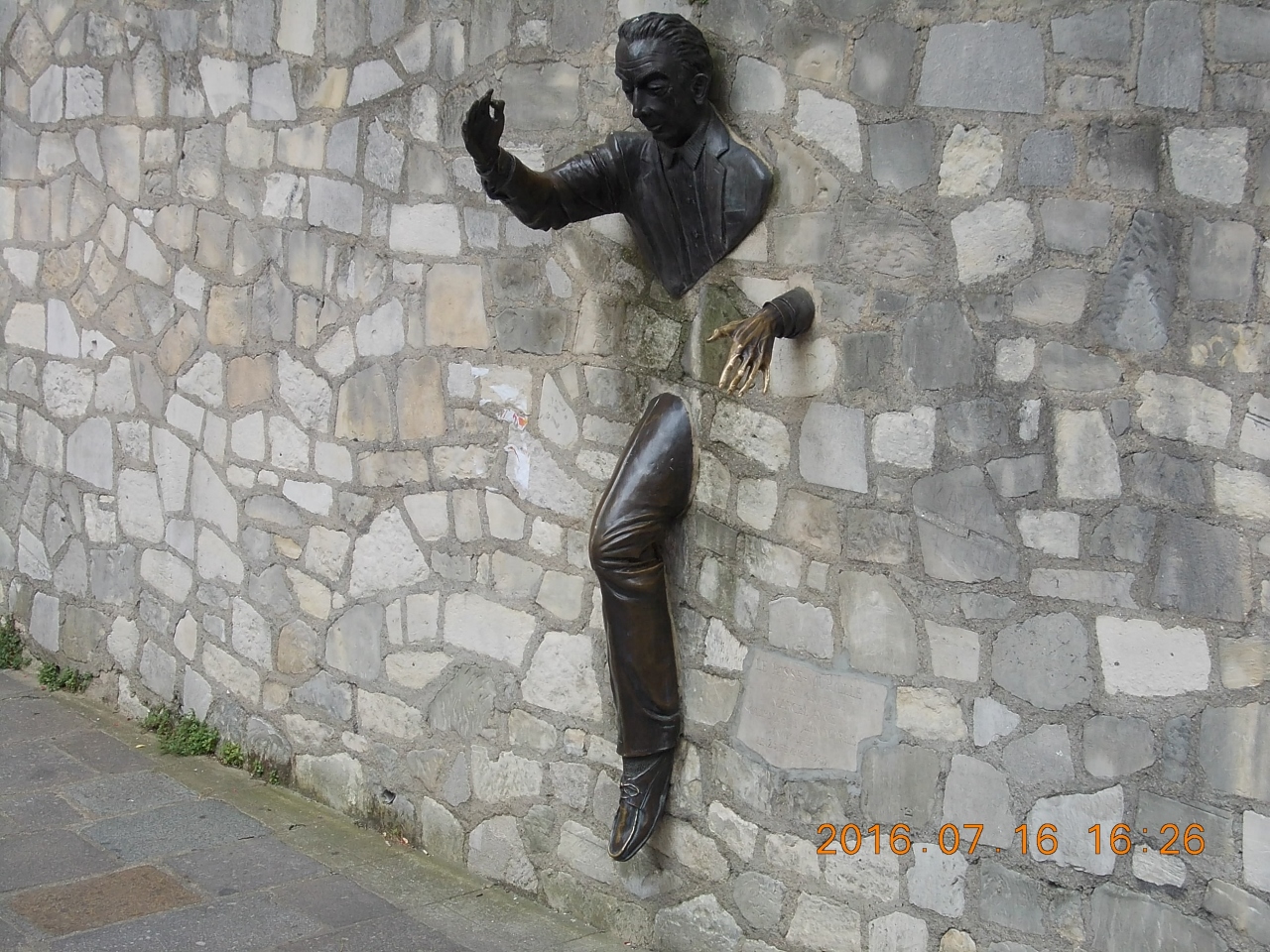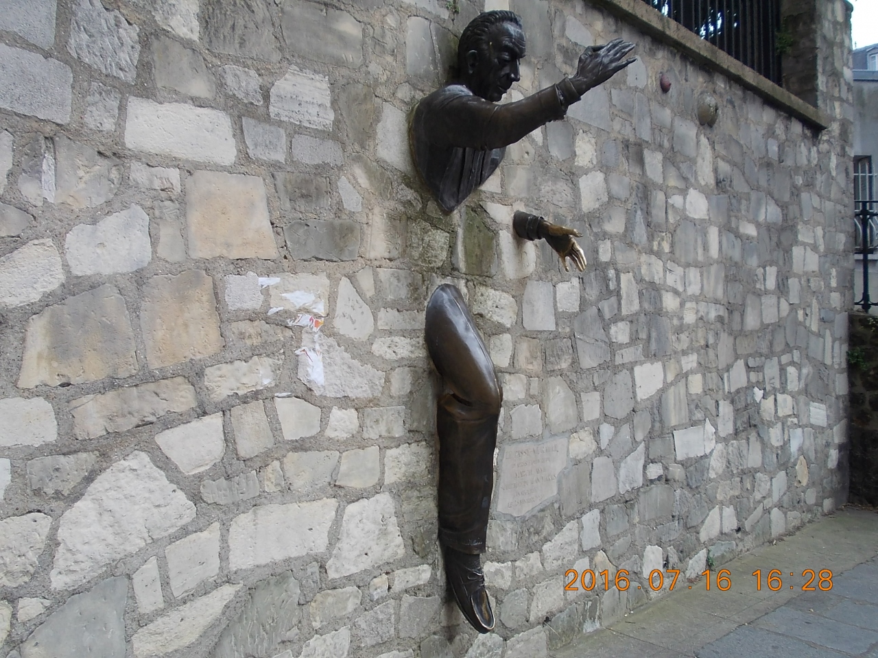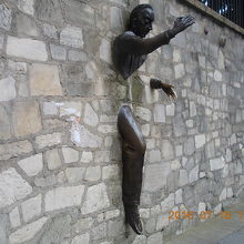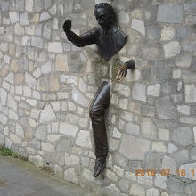 モンマルトルの山頂の教会から降りていくと割とすぐに見つかる。坂の途中の公園のようなところの壁から飛び出すように像が作られている。半分が壁に埋もれているので、ちょっと気持ち悪い面もある。子供が同じ姿をしながら写真を撮ってもらっている光景がほほえましかった。