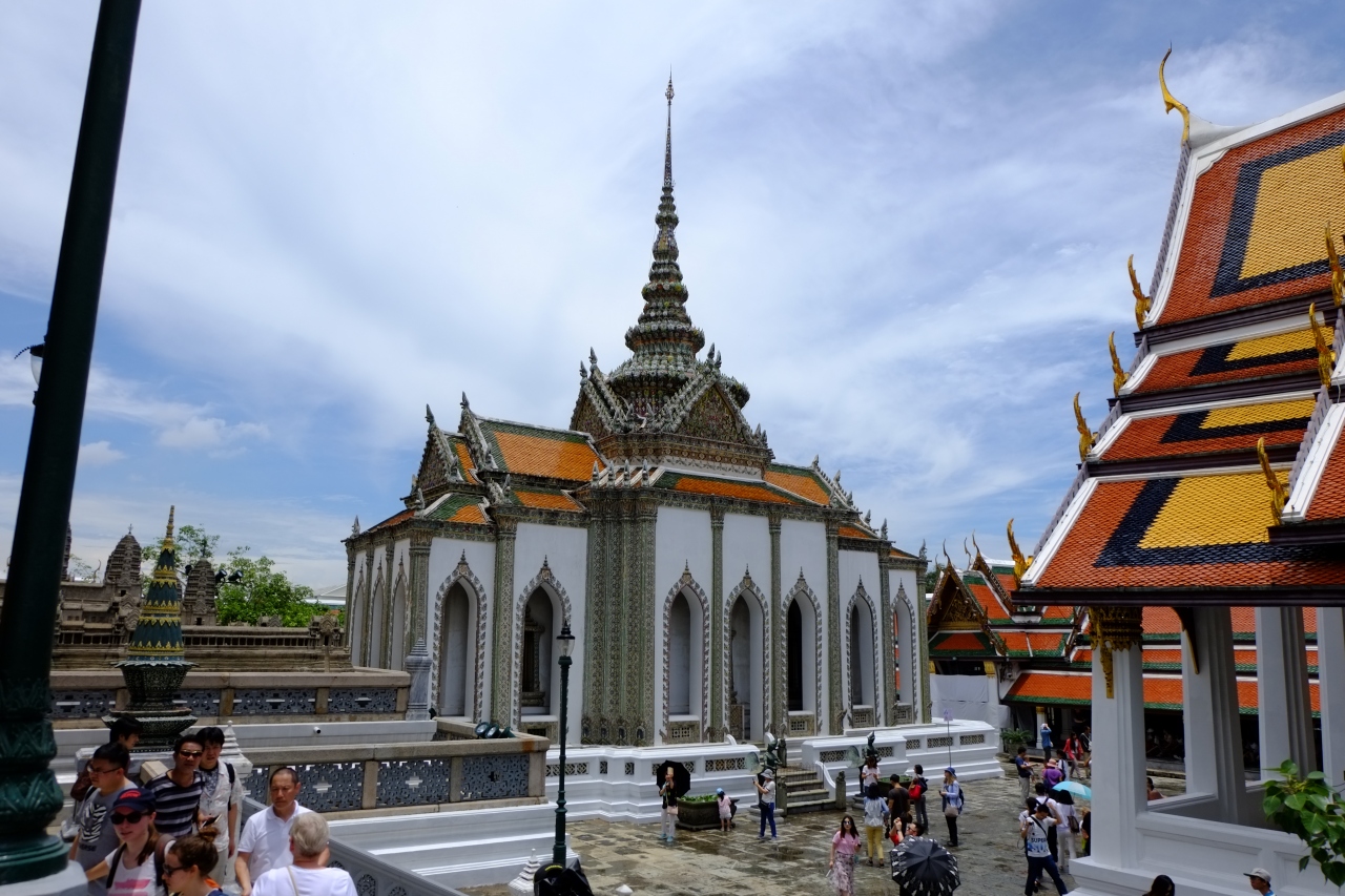 ワットプラケオの中にある建物の一つです。ほかの建物と比べて壁の白さが印象的でした。近づいて見ると、白い中には細かい装飾がなされていて屋根はかなりしっかり装飾されていて、他の豪華な建物と全く遜色ない豪華さでした。