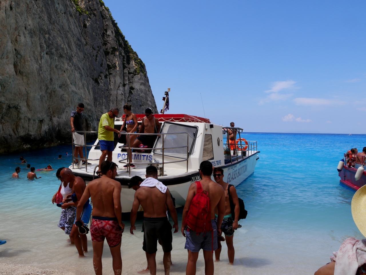 スキナリ岬から少し大型の船で有名なShipwreck Beachへ向かう.約30分の行程だ.結構の高速船 15km ほどの道のりだ スキナリ岬の桟橋を出発.青い海と茶色い断崖が美しい ケファロニア島がよく見える