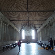 回廊の次に見学する。ラメルヴェイユの最上層に位置する。一番奥の窓と壁に設けられた小窓からの光と中央にあるシャンデリア上のガラスの造形にも光が乱反射して、明るさが保たれている。次は大天使ミカエルとオベール司教のレリーフに進む。