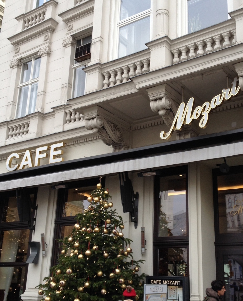 クリスマスの時期だったので、お店の前には大きなクリスマスツリーがあってデコレーションされていました。つるされていたクリスマスオーナメントがまんまるのモーツァルトチョコレートの格好をしていてとても可愛かったです。混んで無い時は落ち着いたカフェで好きですがツアーの自由行動時間でしょうか入ったら半分以上が中国の方だったことがあり、あちこちでお店の方を大声で呼ぶので、あまり落ち着かなかった事がありました。